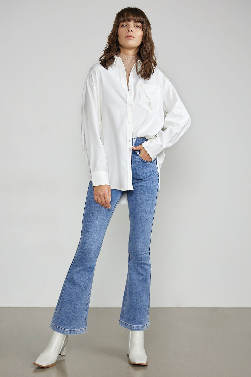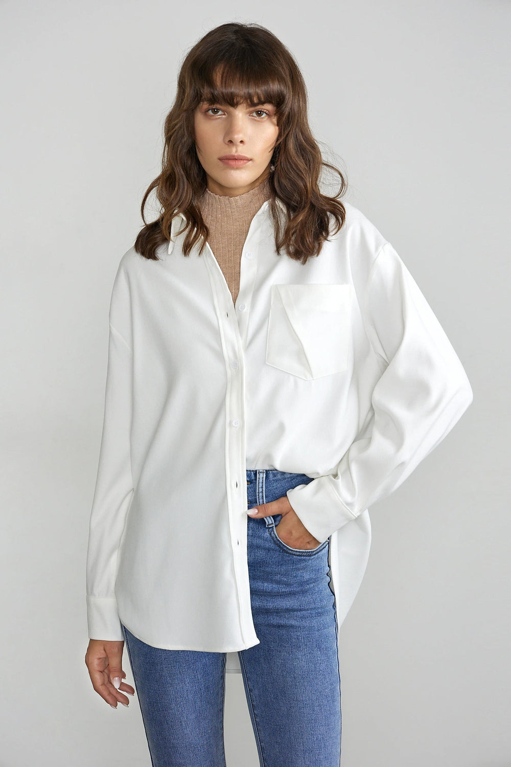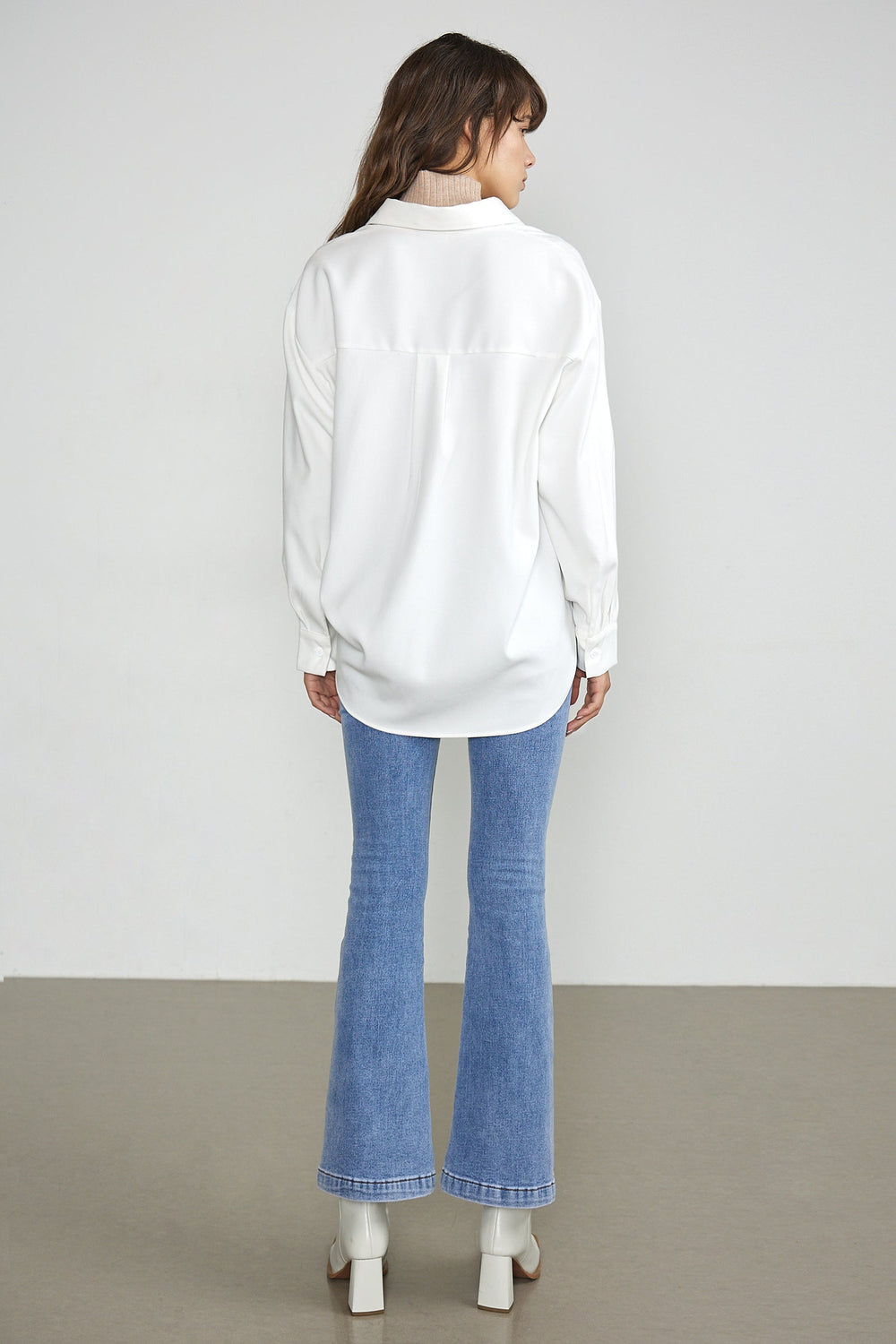 This button up shirt features a professional collar and lovely. long sleeves. Perfect for wearing with high waisted slacks or to the office. Made of polyester and spandex. Available in dark sea green and white.