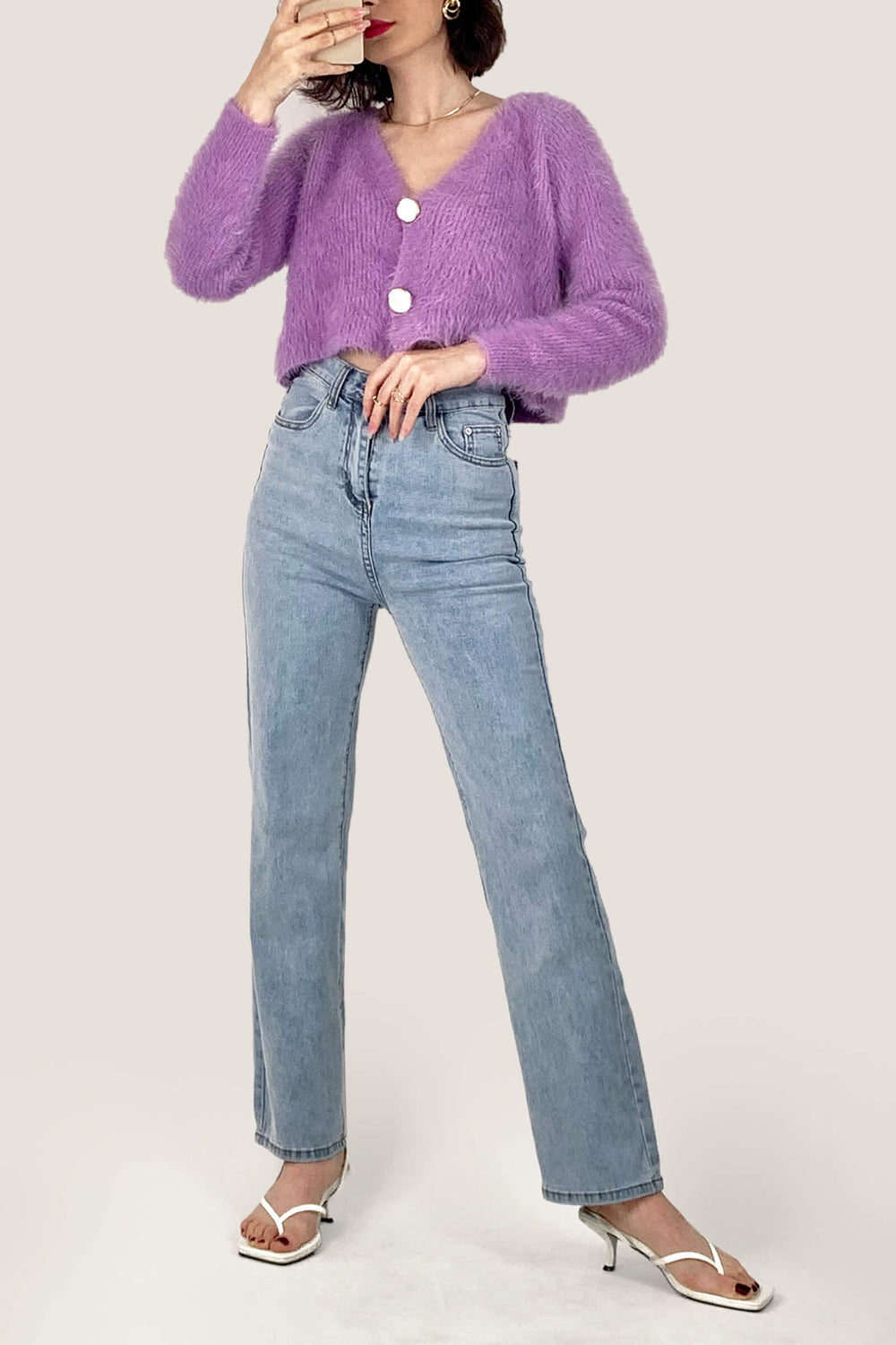 This soft and fuzzy number will get rid of the winter blues without a doubt. It features a V-neckline. long sleeves. two buttons at the front and a cropped length. Pair with some high-waisted denim jeans. boots and a baguette bag for a casual-chic day or night look!