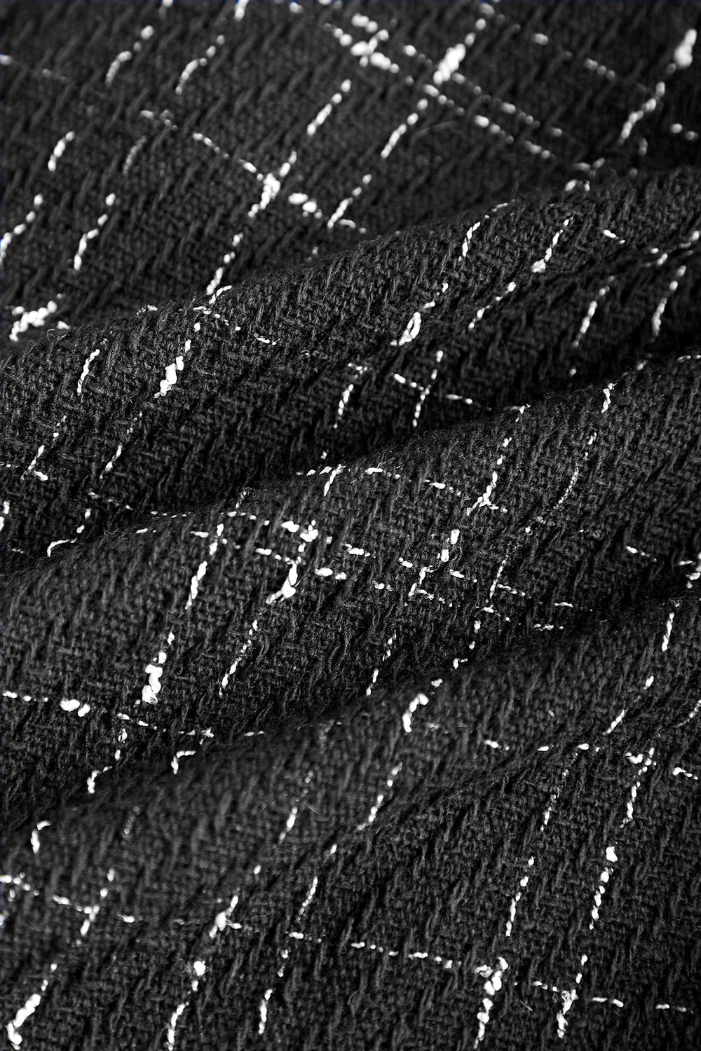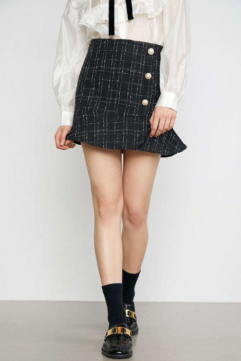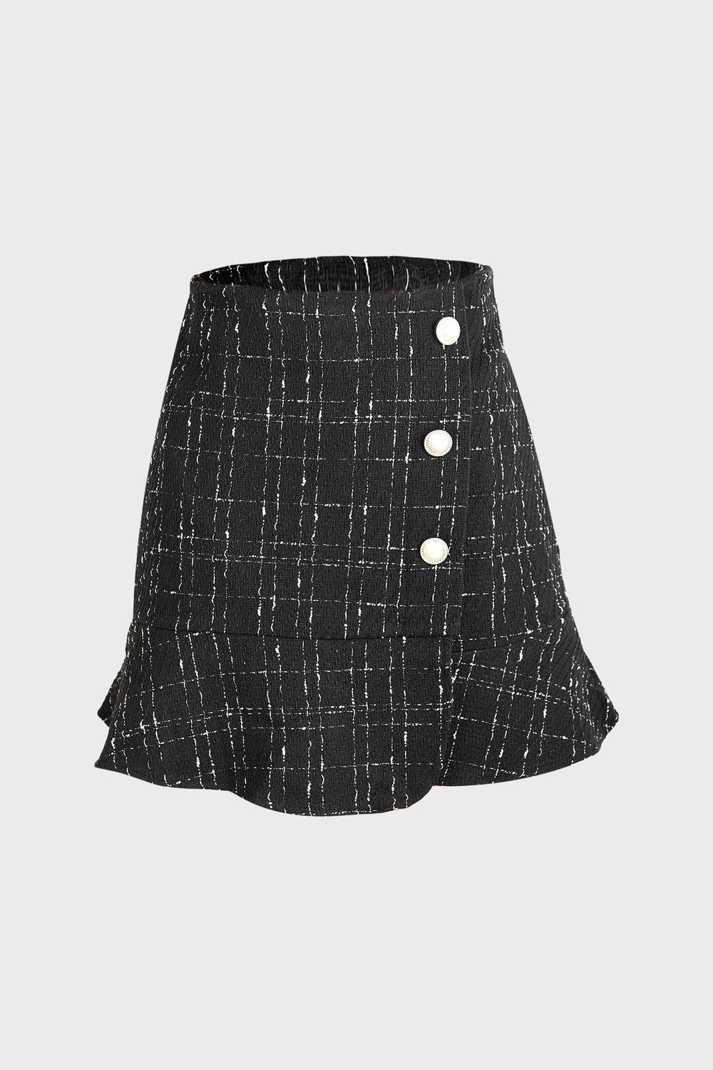This chic skirt has a unique asymmetrical flair. Features high waistline. slit and frilly hem. and gold buttons. Made of 100% polyester. Pair with cropped blazer for a sophisticated and playful look.
