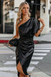 If what you want is to look fabulous then you can definitely get what you want right here with this midi dress! This satin midi is stunningly chic! The waist design keeps it very flattering and every detail is perfectly feminine! This dress couldn't be more perfect attending weddings! This midi dress features a one-shoulder neck. satin fabric. short flare sleeves. and a tulip hem.