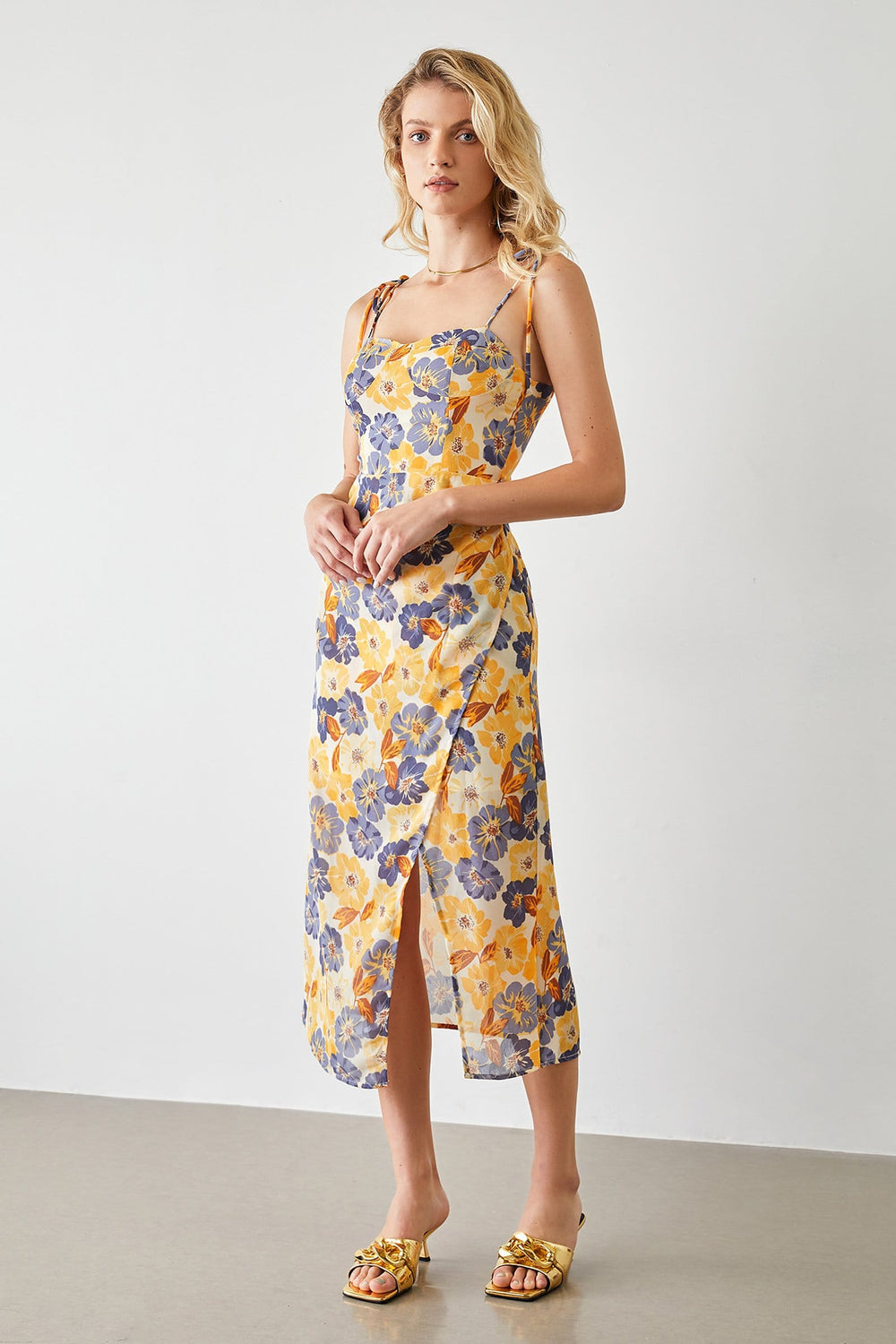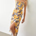 Show off your shoulder in this bodycon halter midi dress features fitted silhouette. and bright gold color with floral pattern.
