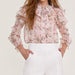 This floral chiffon top is a must-have your new season wardrobe! It features a self tie neckline. long balloon sleeves with tiered ruffles and elastic cuffs. a relaxed bodice. and an all-over blooming floral print. Style with blue jeans. slides and a matching shoulder bag for a catch-up with the girls.