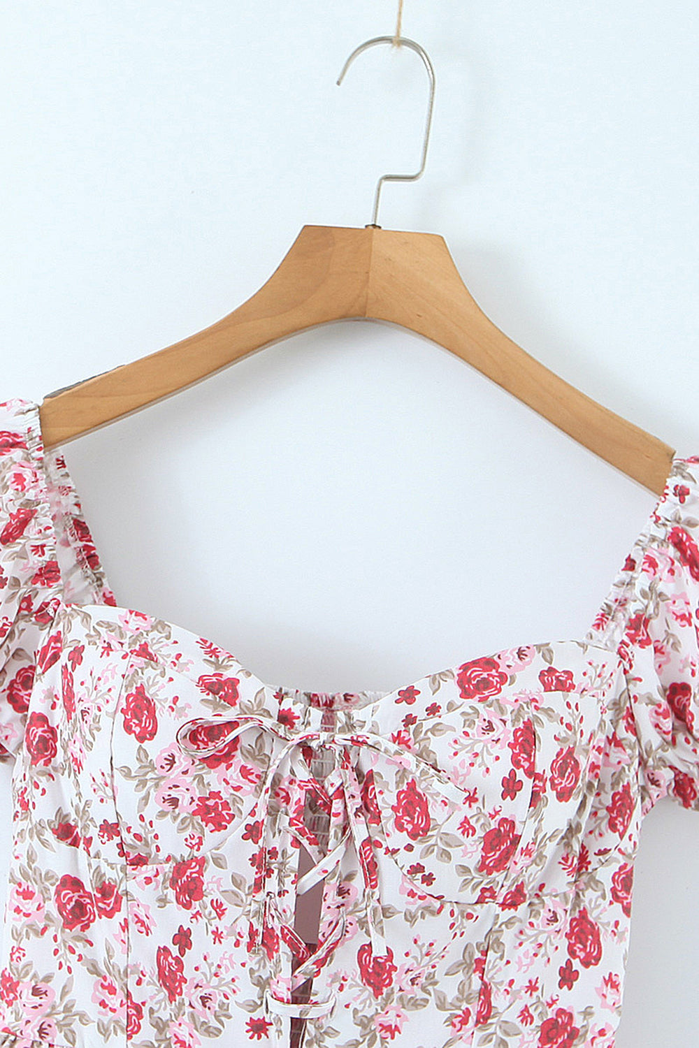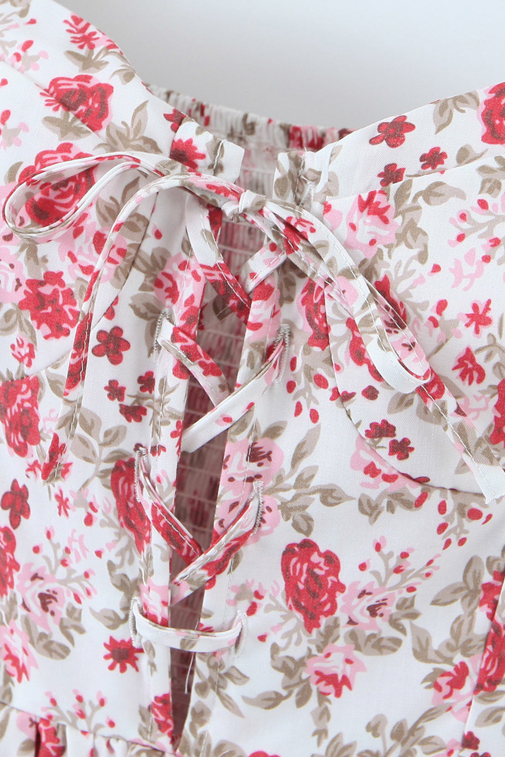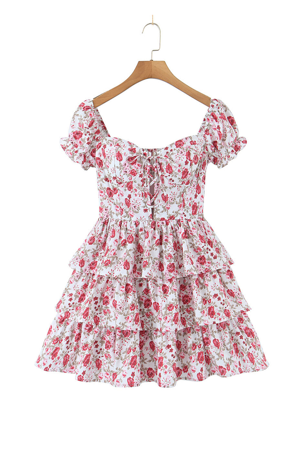 Get ready to be swept away to a world of romance by the Pink Floral Print Tiered Bustier Mini Dress! Lightweight pleated woven fabric. decorated with vintage-inspired floral print. shapes this gorgeous dress.A fitted waist tops a tiered skirt that ends at a mini hem. The flowy bodice is accented with a cinching tie at the center of the bust.