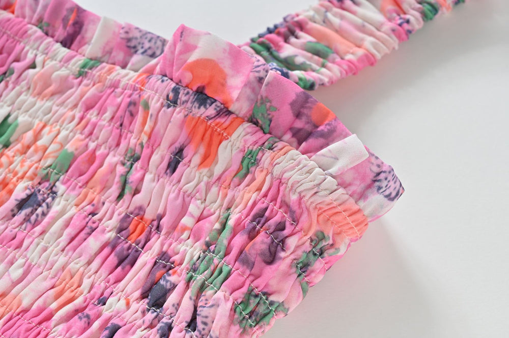 floral-print smocked midi dress featuring rose pink. multicolour. plissé effect. floral print. smocked panel. gathered detailing. square neck. wide shoulder straps. tiered skirt. lettuce hem and mid-calf length. Conscious: This item is made from at least 50% recycled or upcycled materials.Â