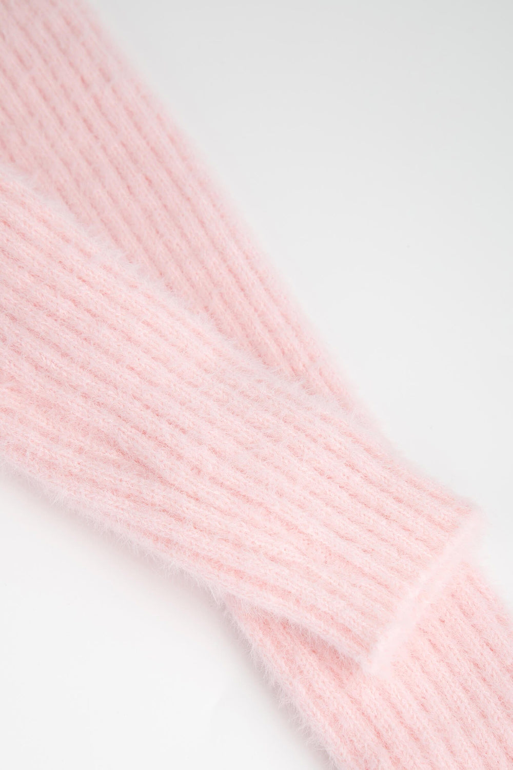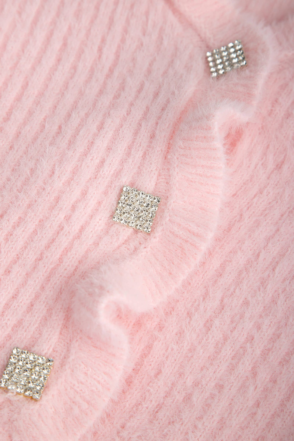 This cardigan is a must-have for the season ahead. Shorter-style. fitted cardigan in a rib knit with a V-neck. rhinestone buttons down the front and long sleeves. Ruffle trim at the neck. front and hem.