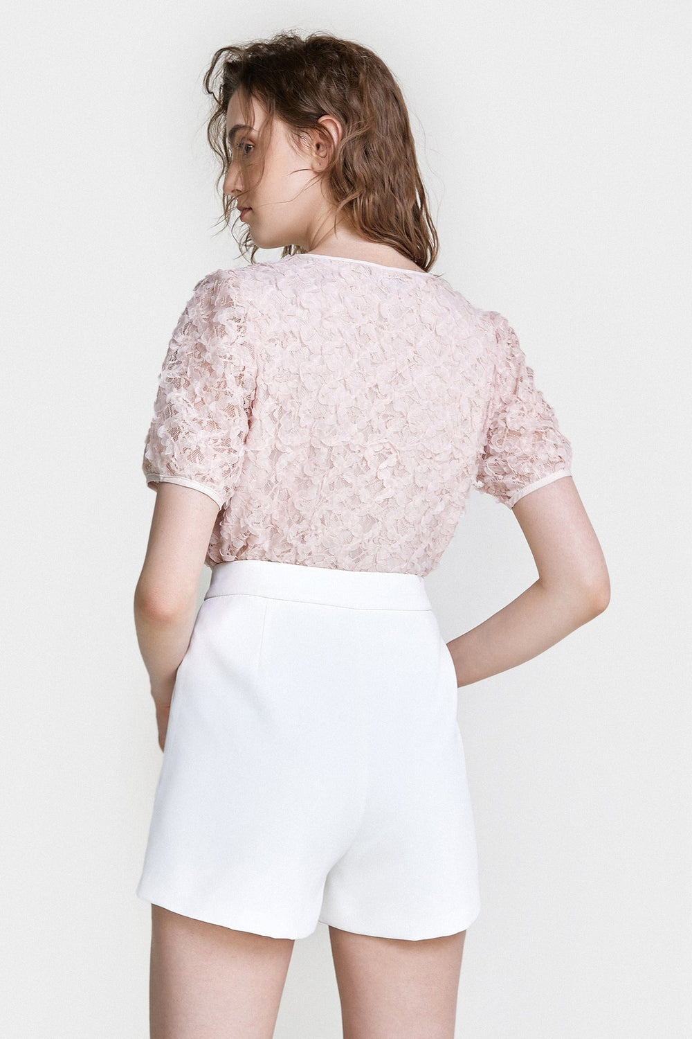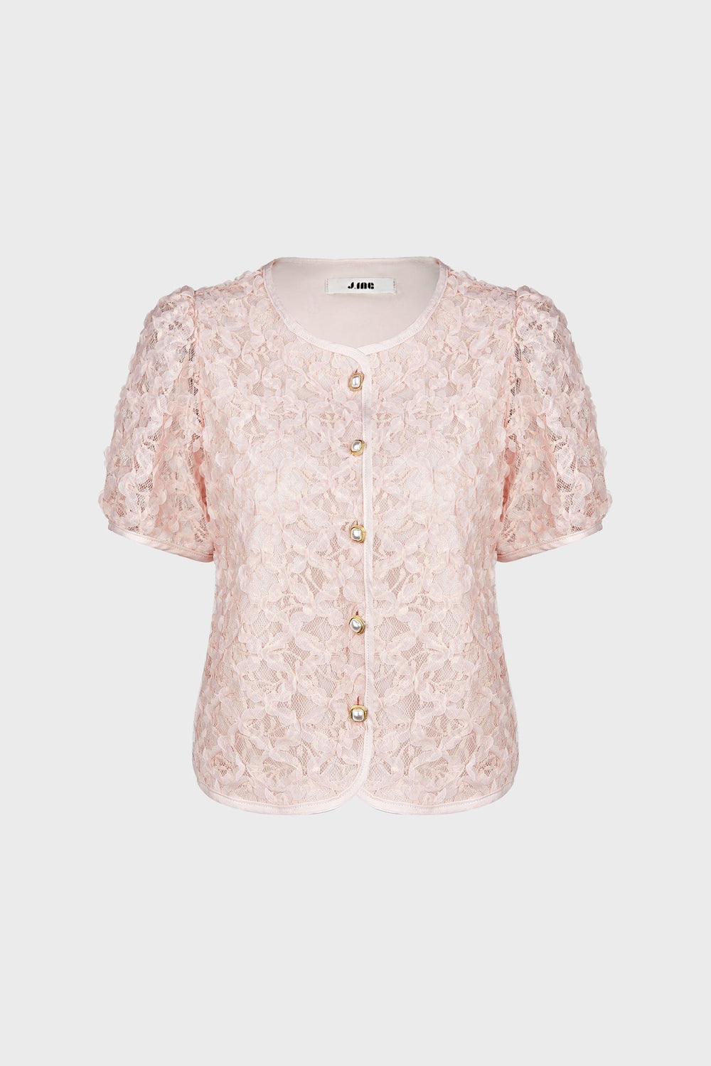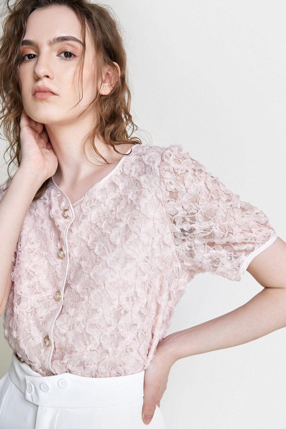 Give your look a seriously chic update with this top. Featuring a textured floral design with a button front and short sleeves. style with high waisted jeans and mules for a catch up with girls.