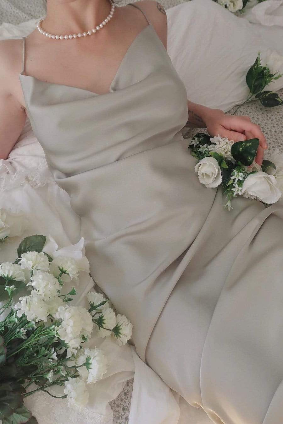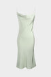 Be enchanted. A silky pistachio green midi slip dress featuring spaghetti straps and a cowl neckline. For all your après-midnight occasions.