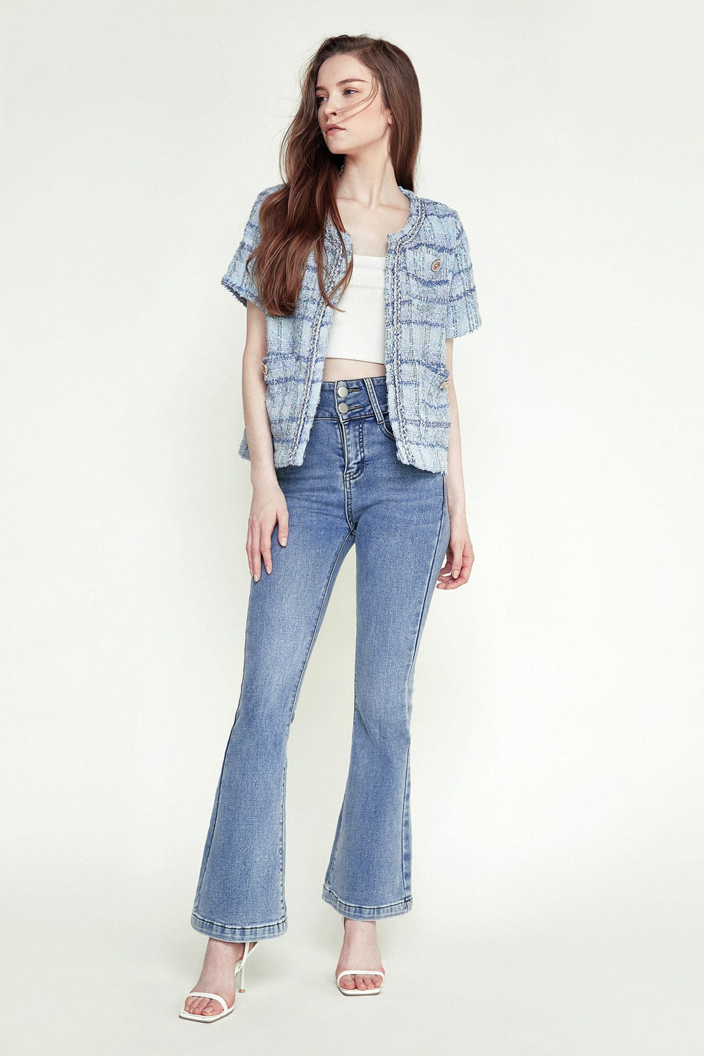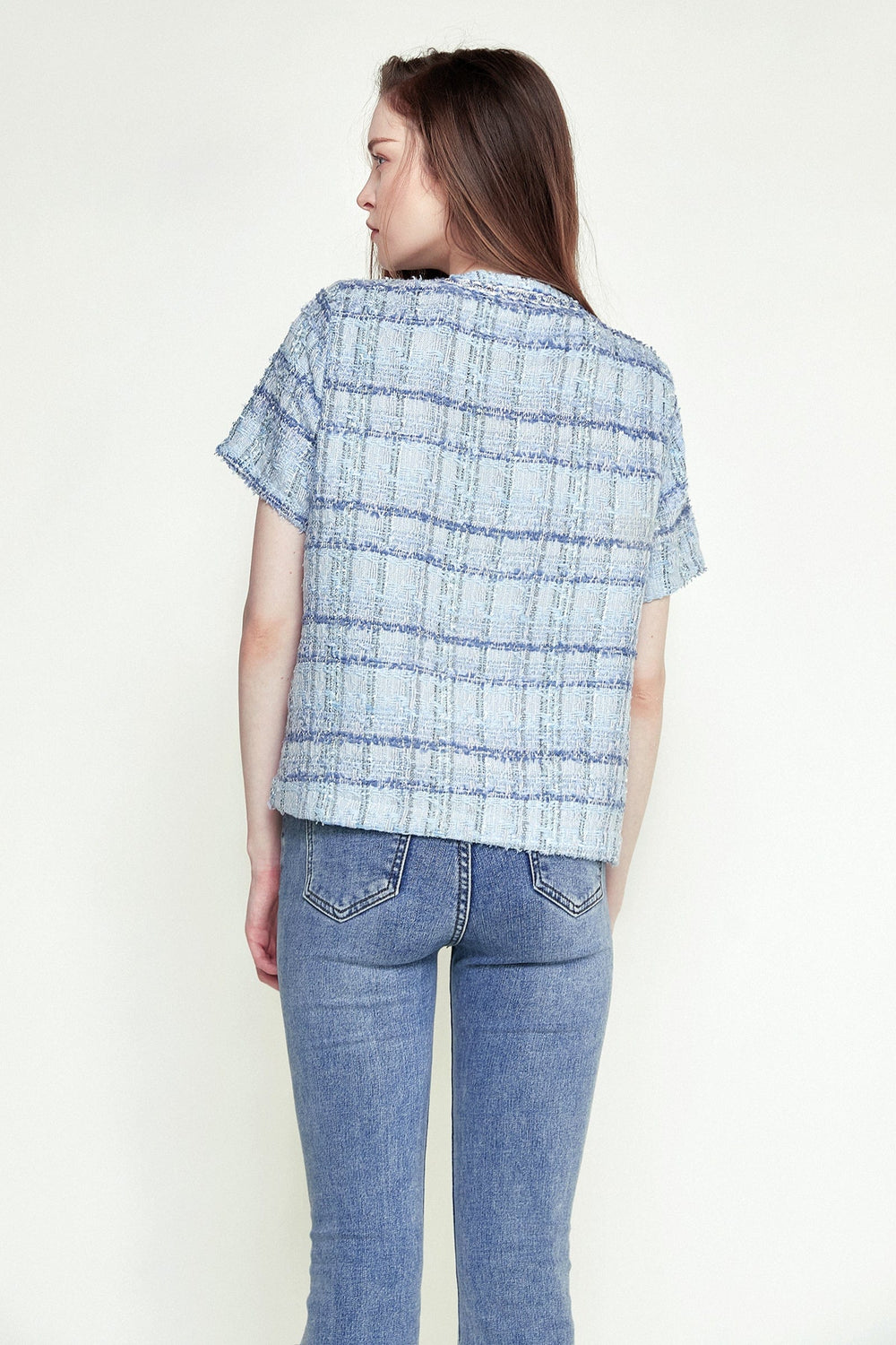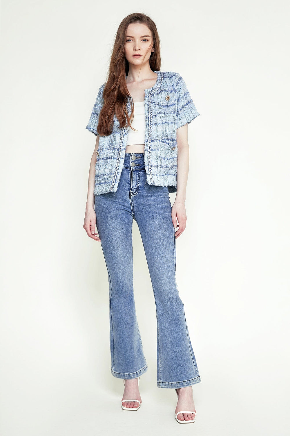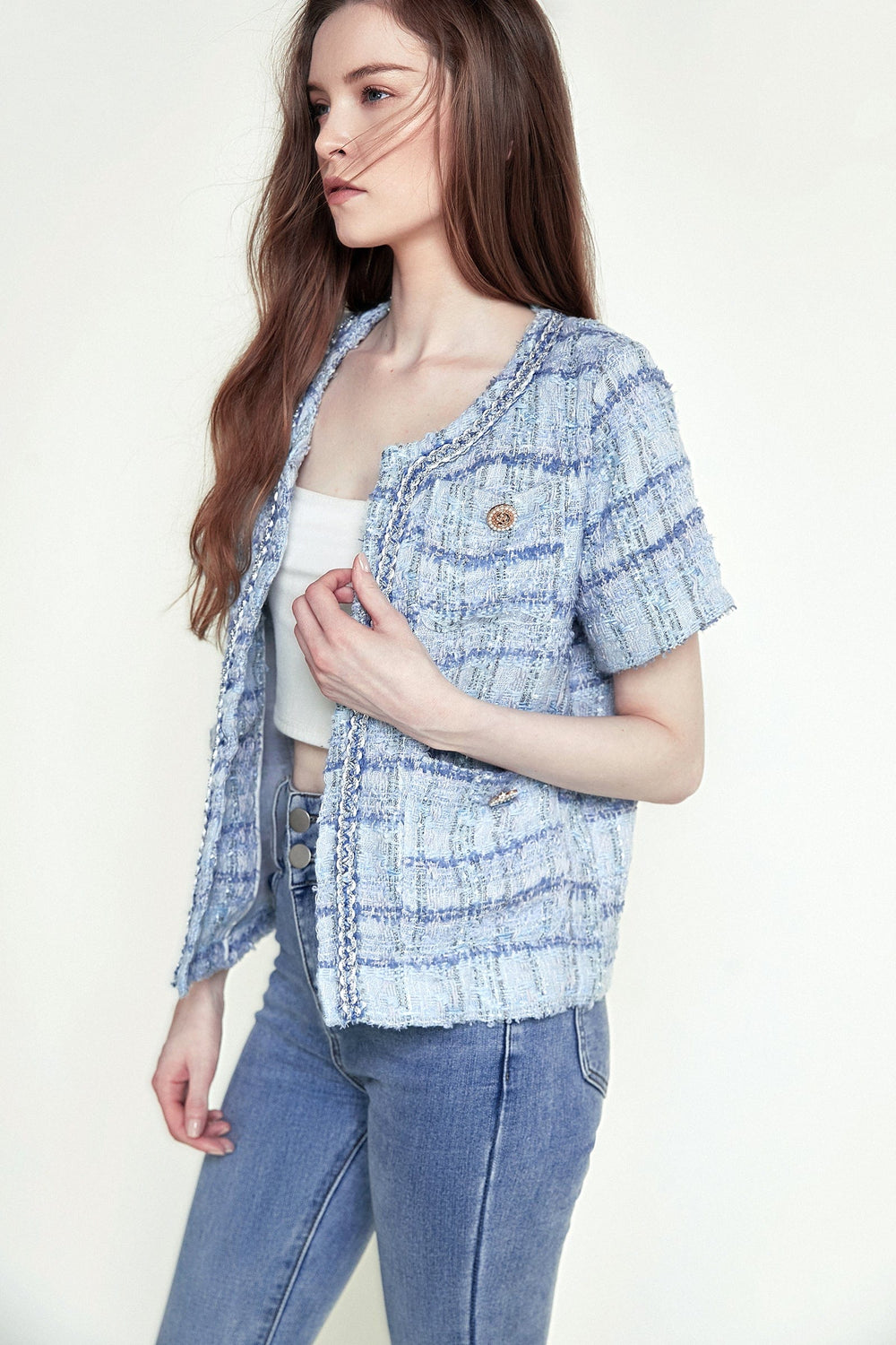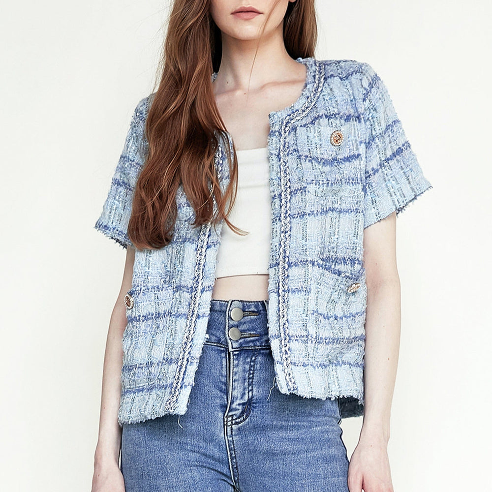 Take your look to new heights with this jacket. Featuring front patch pockets with button detail. short sleeves. and an open front. Style this with some matching bottoms and statement accessories for the ultimate edgy combo.