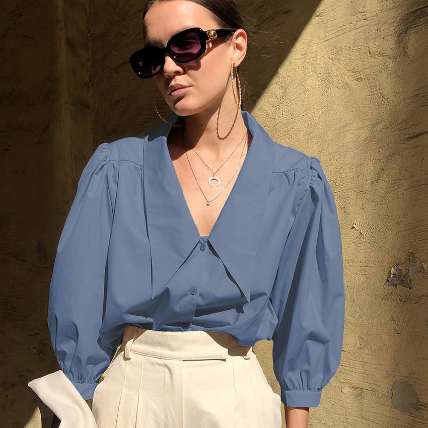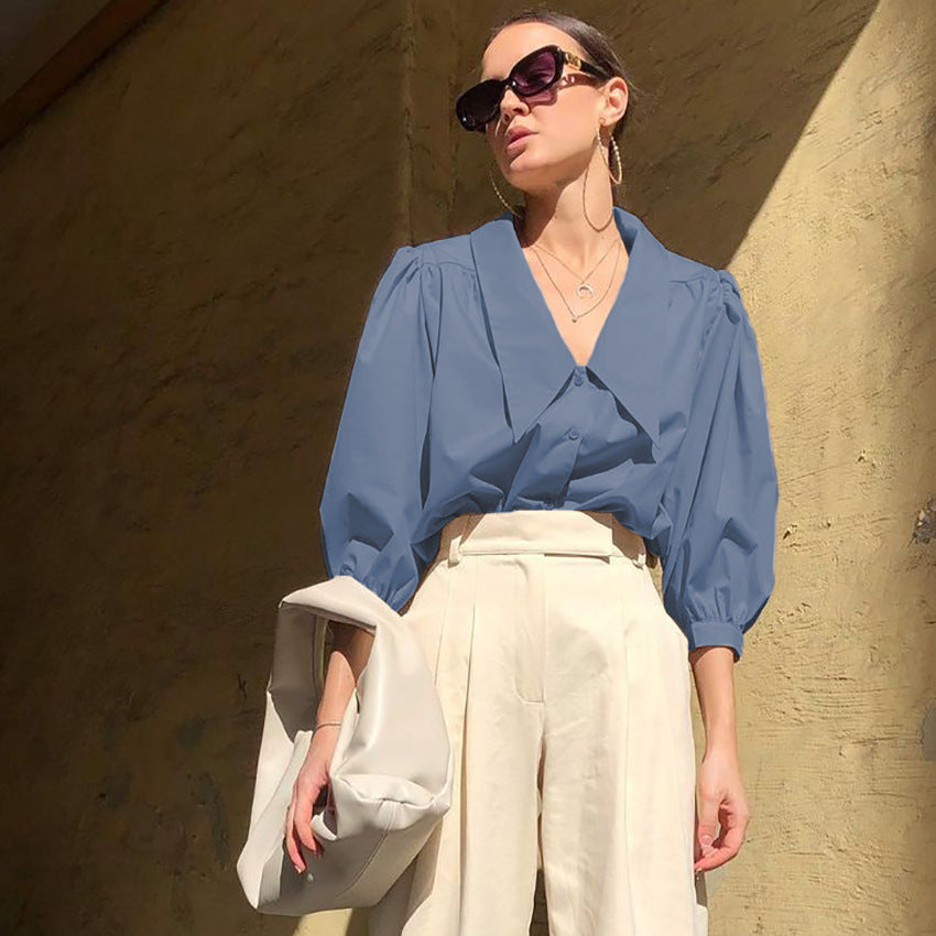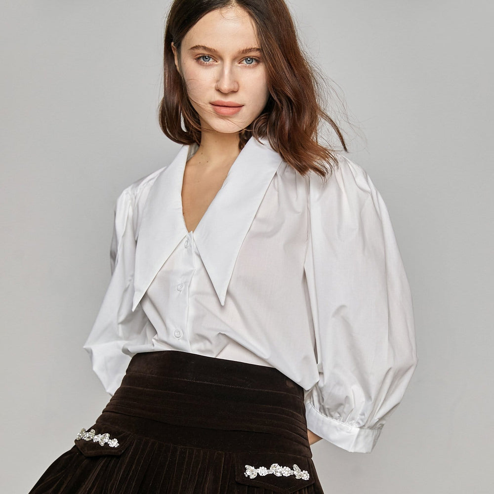 This basic white shirt has a lapel collar. front button closure and puff sleeves. Basic and versatile shirt that goes well with your favorite denim jeans. perfect for casual. daily wear.