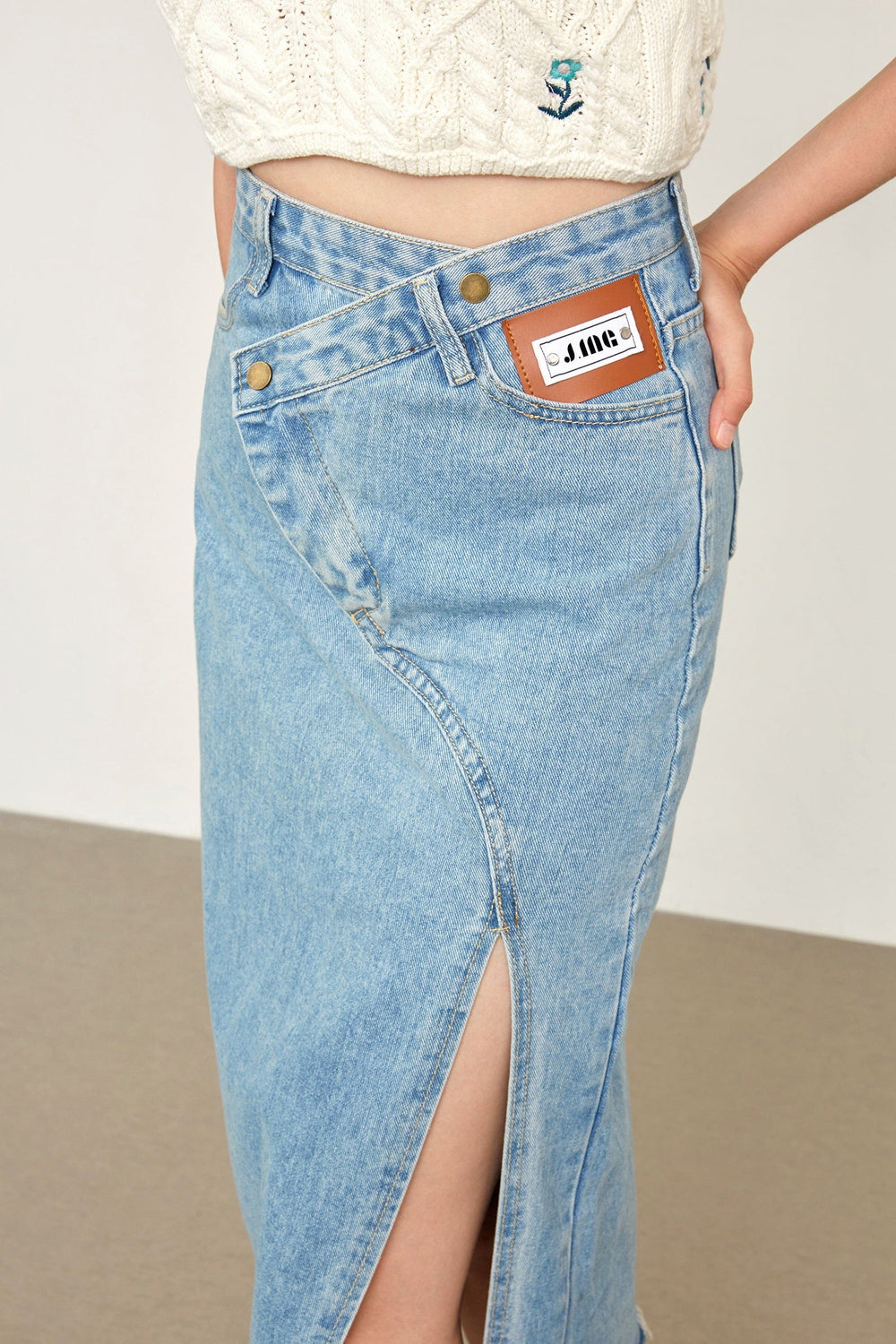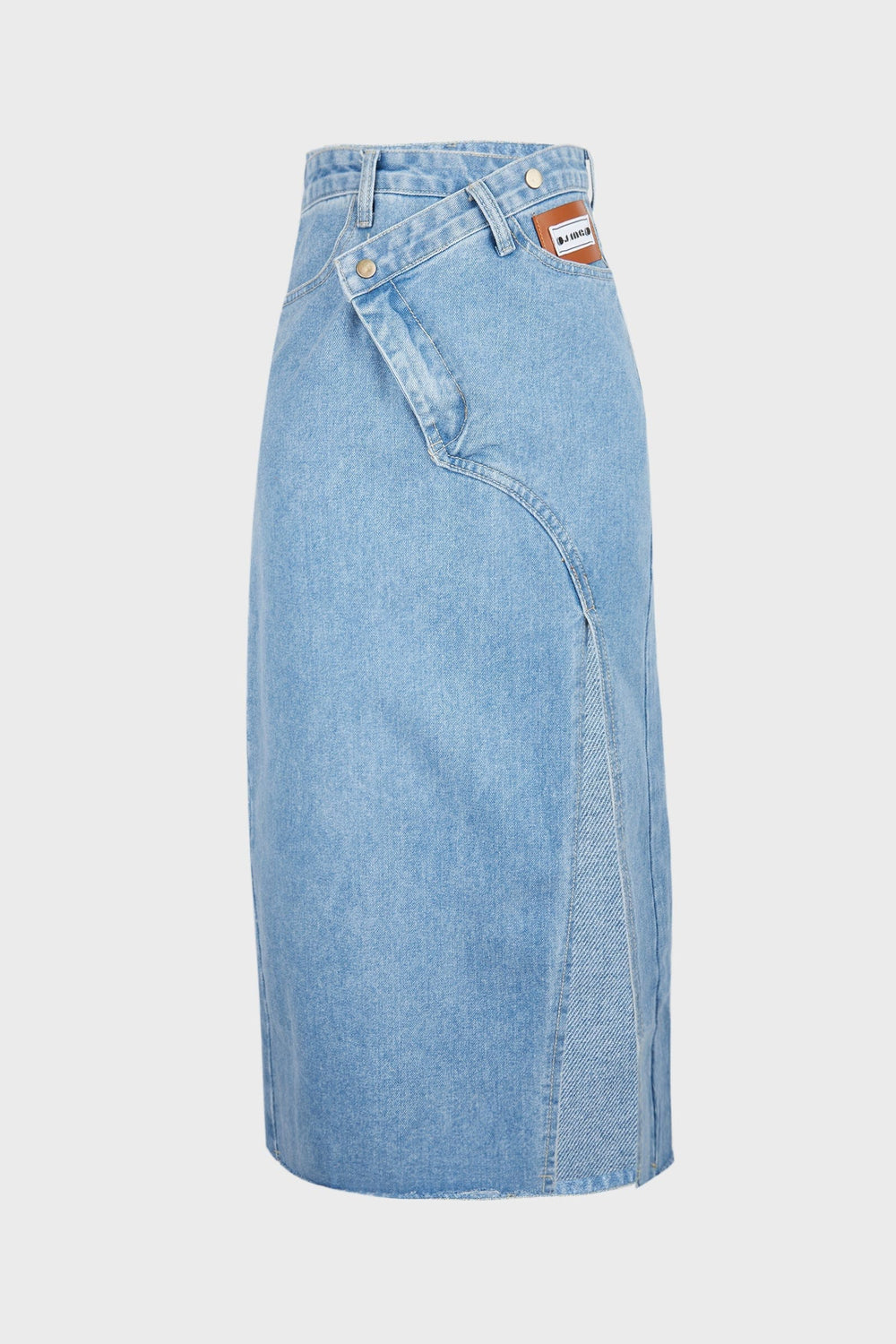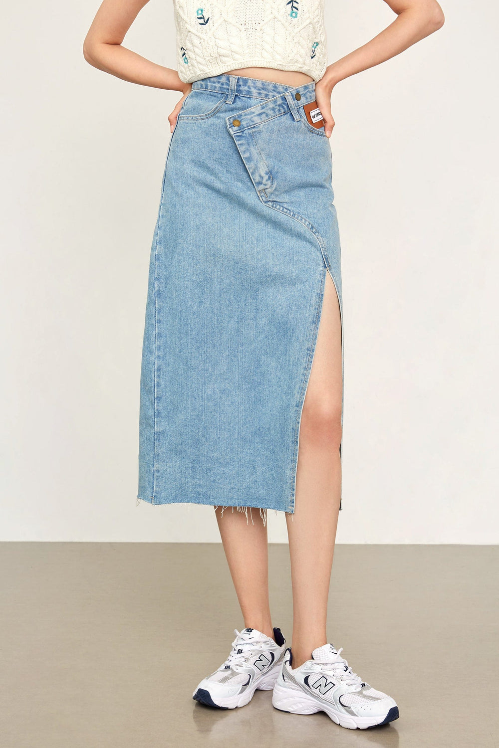 This denim midi skirt has a unique asymmetrical flair. Features a high waistline and a slit hem. Pair with sneakers and shirt for your both lazy and active days. Made of smooth cotton. viscose and polyester.