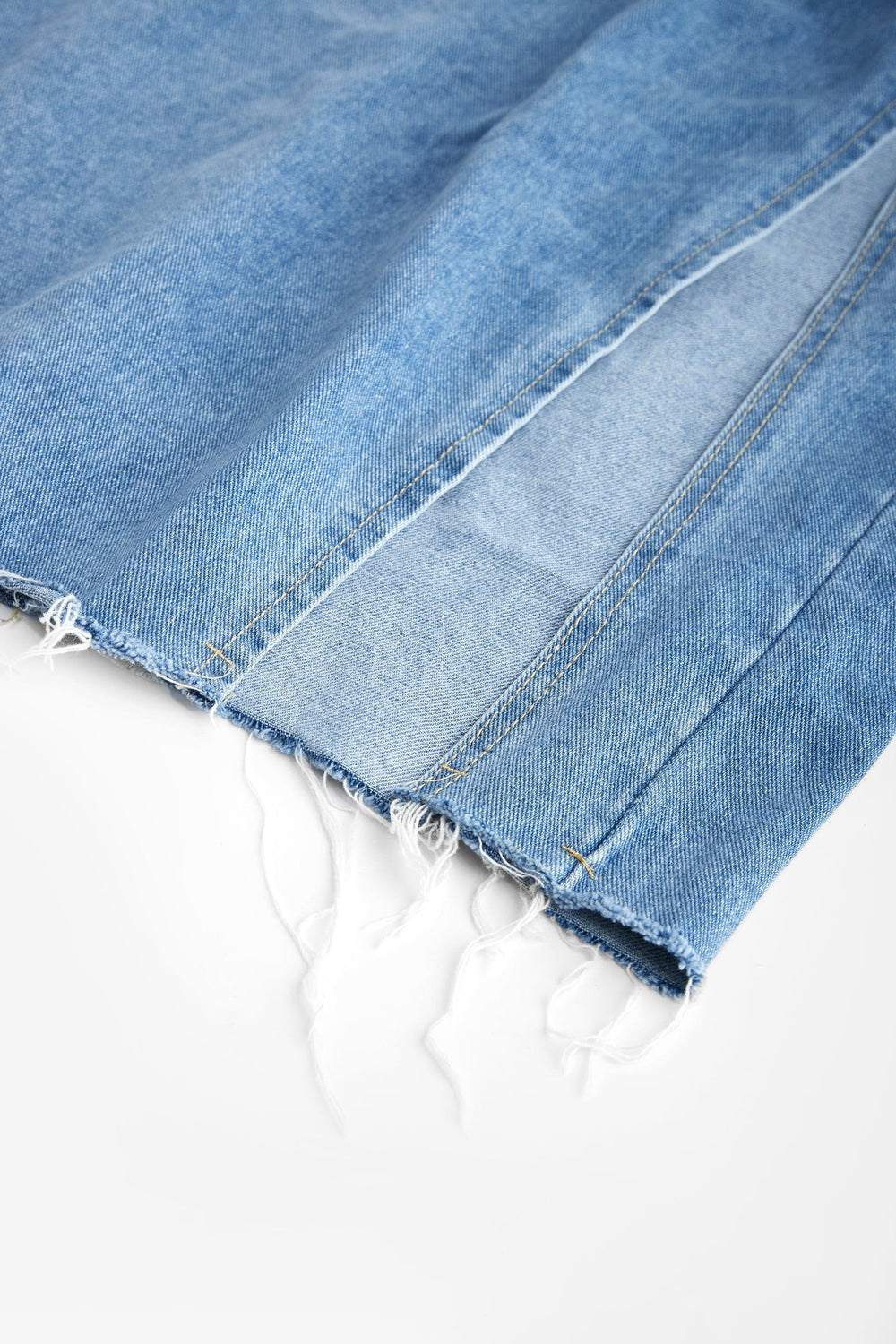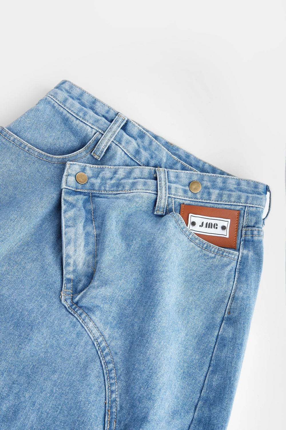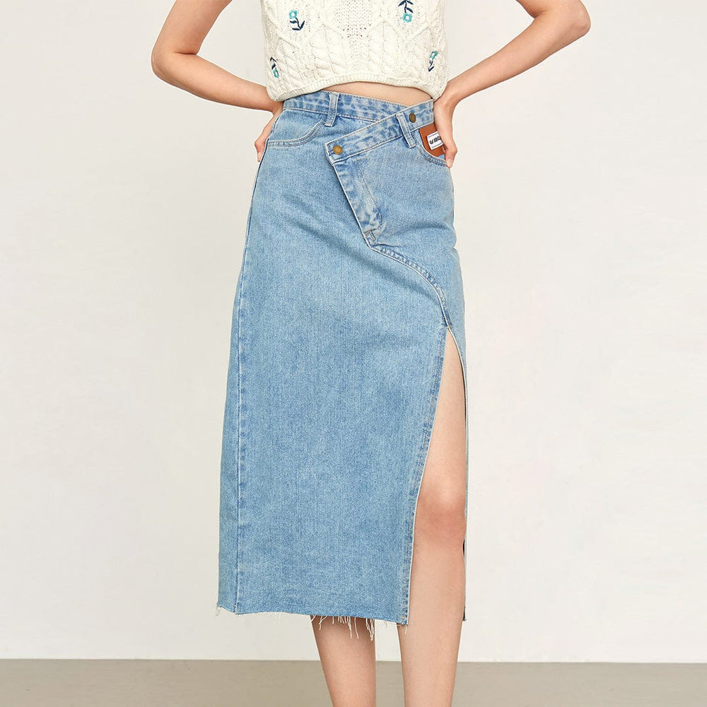 This denim midi skirt has a unique asymmetrical flair. Features a high waistline and a slit hem. Pair with sneakers and shirt for your both lazy and active days. Made of smooth cotton. viscose and polyester.