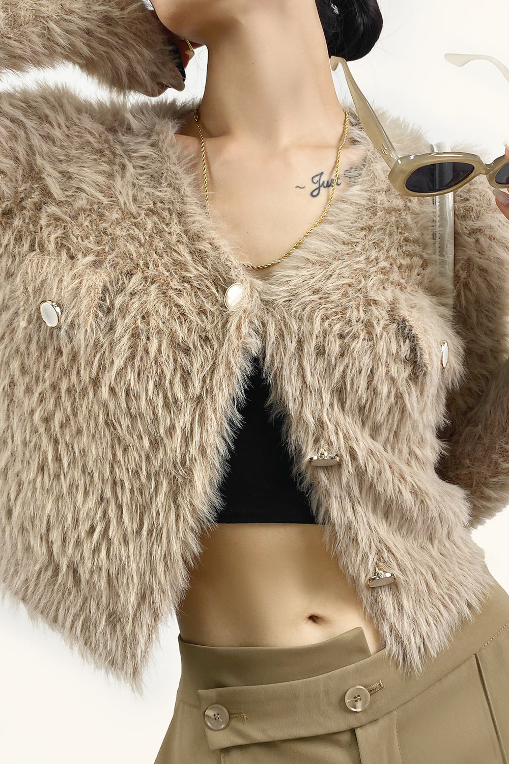 Keep warm while stay stylish in this soft and fuzzy knit cardigan. It features a V-neckline. a button-up front. faux flap pockets. long sleeves and a cropped length. Wear yours with everything from denim and skirts to tailoring.