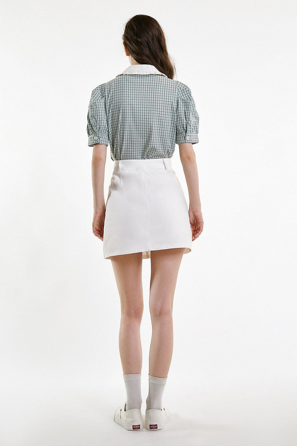 Give your weekend look some attitude with this shirt. Featuring a plaid design and a button placket. The ruffle-trimmed statement collar and puff sleeves add a feminine finish touch.