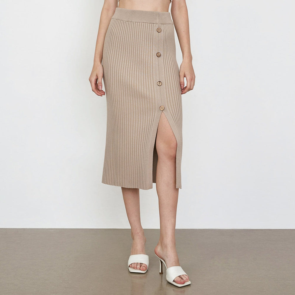 This asymmetrical skirt is a classic stand-out piece. Featuring button decoration and high split ham. Pair this cute skirt with a blouse. Wear it on your day off or at the office!