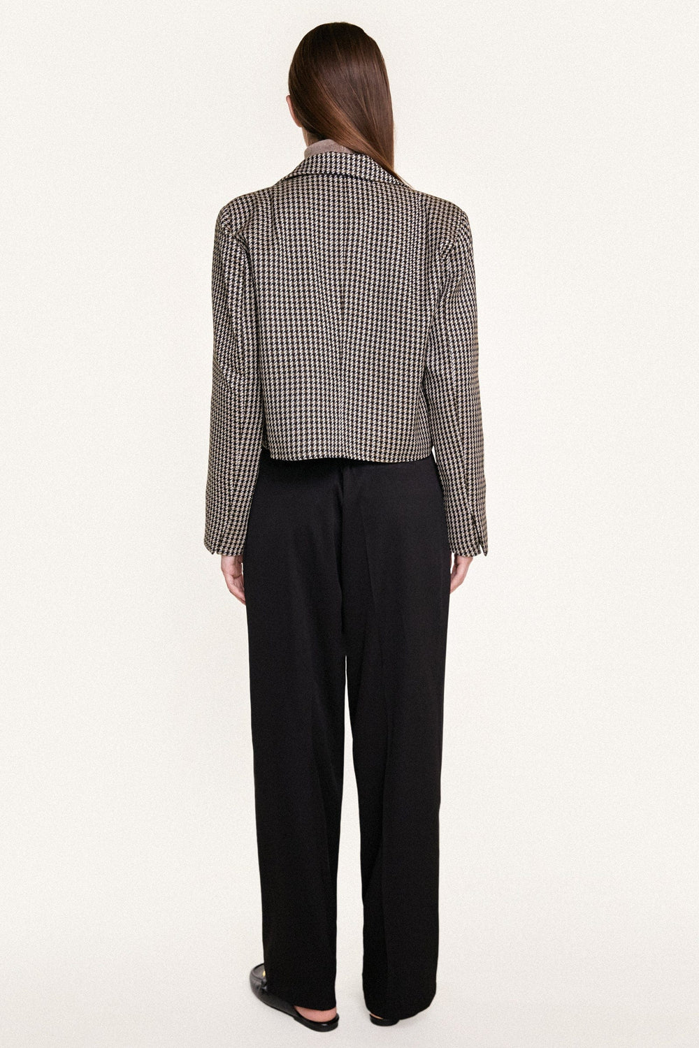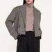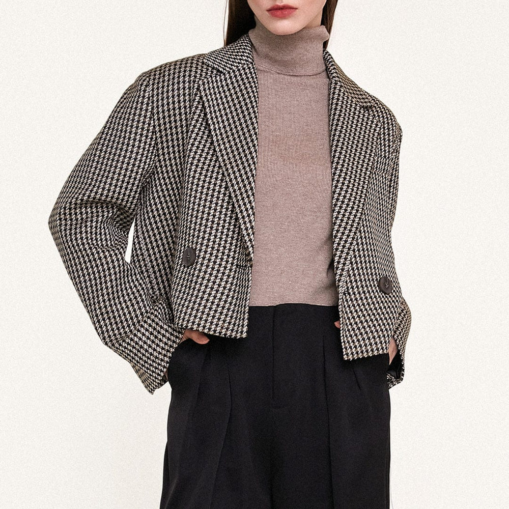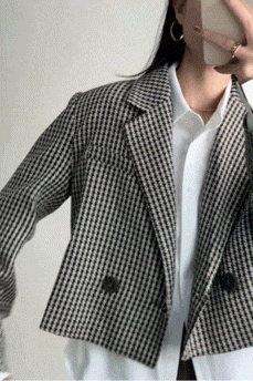 This blazer features a lapel neckline. long sleeves with slit at cuffs. a mock front pocket. cropped length. a double-breasted front and a lining.