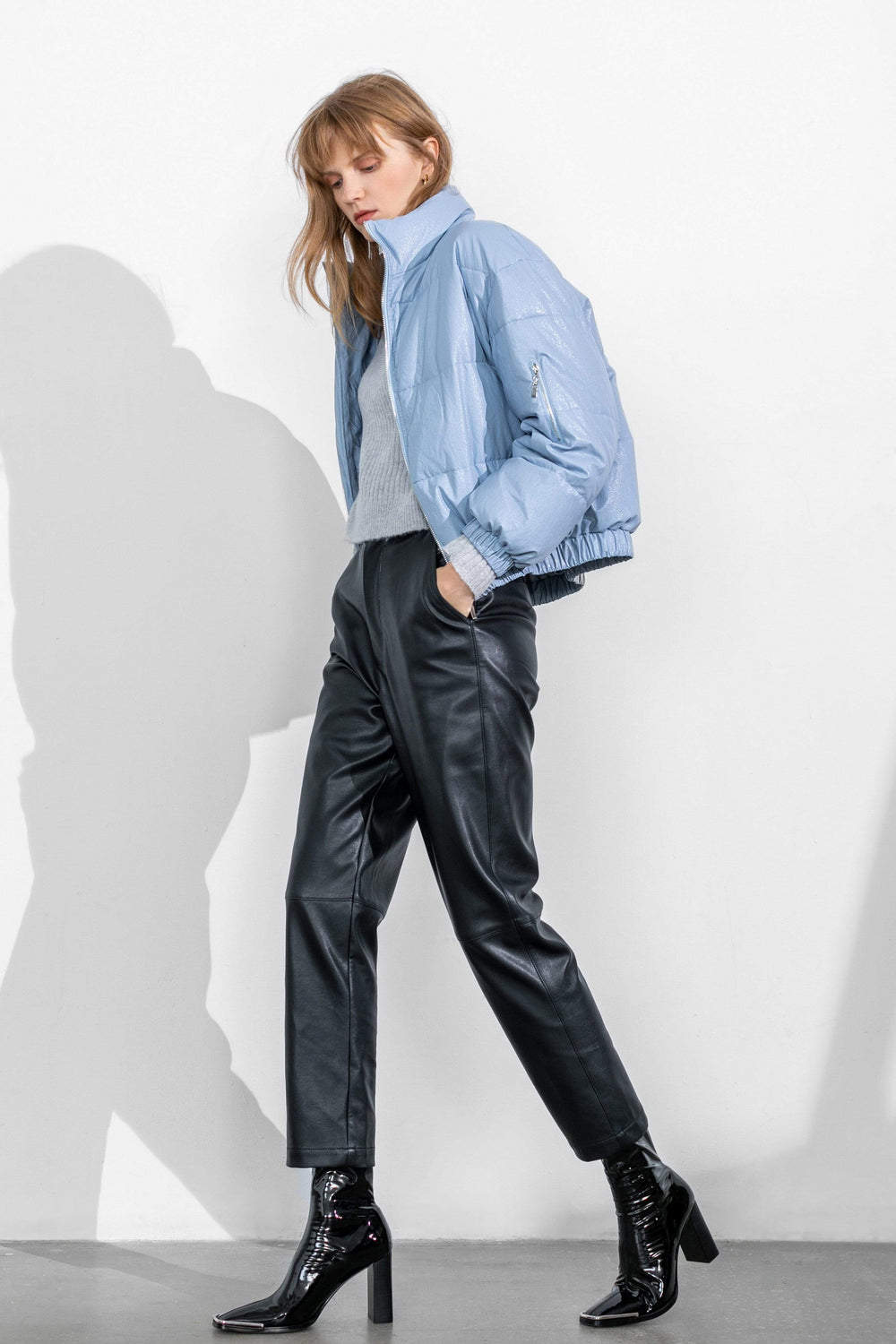 Your puffy winter dream. A shiny blue quilted puffer jacket featuring a high neck. zip-up front and side pockets. Made of waterproof material for ultimate coverage. Foldable into your favorite carry-on for the on-the-go woman. A slightly cropped and oversized fit. with enough room to layer your favorite light knits. Maximum warmth and comfort. Pair over matching leather pants for a sleek motorcycle-chic look.