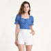 Make this blouse your new go-to this season. Featuring a blue woven fabric with a white polka dot print. a sweetheart neckline with a cute tying detail. puff sleeves with elastic. ruffle cuffs. and a cropped length. Smocking at back for a better fit. Pair with high waisted jeans and mules for a chic combo.