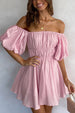 You'll catch every eye in the Stunning Inspiration Off The Shoulder Flare Mini Dress! Textured woven satin shapes short balloon sleeves with tying cuffs (and elastic at the shoulders) that frame a sweetheart bodice with light gathering and a crisscrossing empire waist. Sash ties accent the back of the waist for a charming detail. Skirt has a skater-style silhouette and falls to a tiered mini hem.