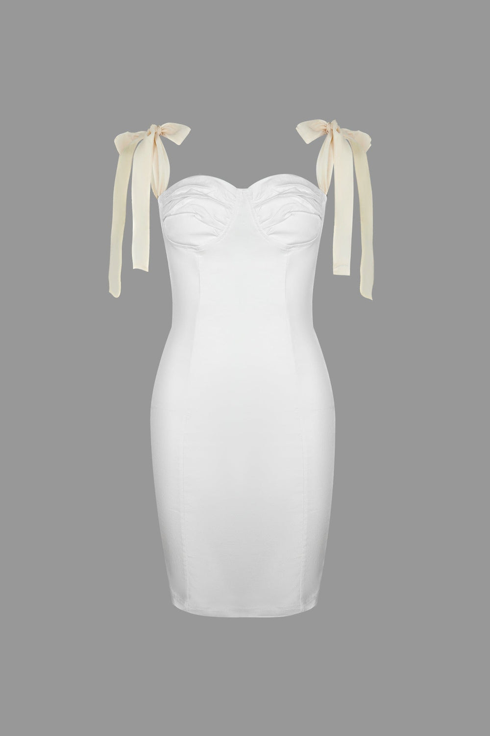 This formal mini dress has a sweetheart neckline and bodycon fit. Features whimsical shoulder bow straps. Available in both black and white.