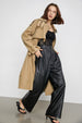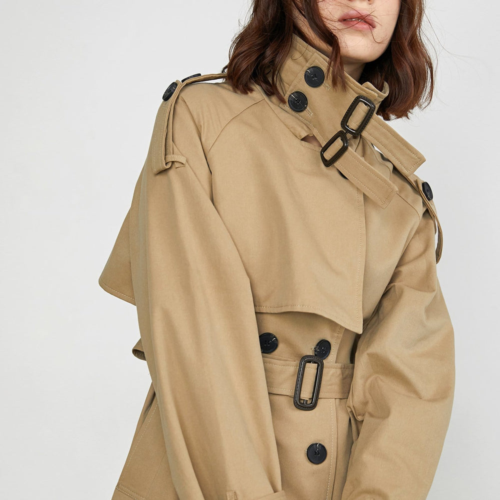 This longline women's trench coat features long sleeves with belt cuff. a lapel collar. a double-breasted placket. and a high defined waistline with belt. Made of polyester and cotton.