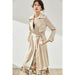 The trench coat is crafted from triacetate fabric. providing two different tactile experiences. It offers excellent elasticity. resulting in a smooth and comfortable feel against the skin. The straight H-shape design enhances comfort and inclusivity. Additionally. it is accompanied by a coordinating fabric belt. allowing for waist cinching and creating a flattering slimming effect.