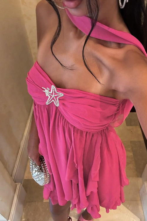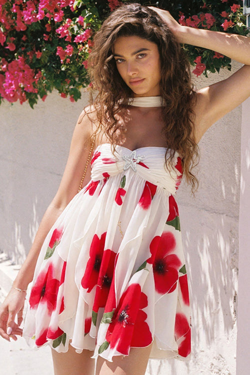 You'll catch everyone's attention when you breeze by in the Vaivah Halter Neck Print Mini Dress! Lightweight woven fabric shapes a playful floral print. ruffled detailing and a flattering halter-neckline. High. fitted waist tops a A-line mini skirt. From casual moments to dressed-up occasions. this cute dress is your go-to for understated elegance.