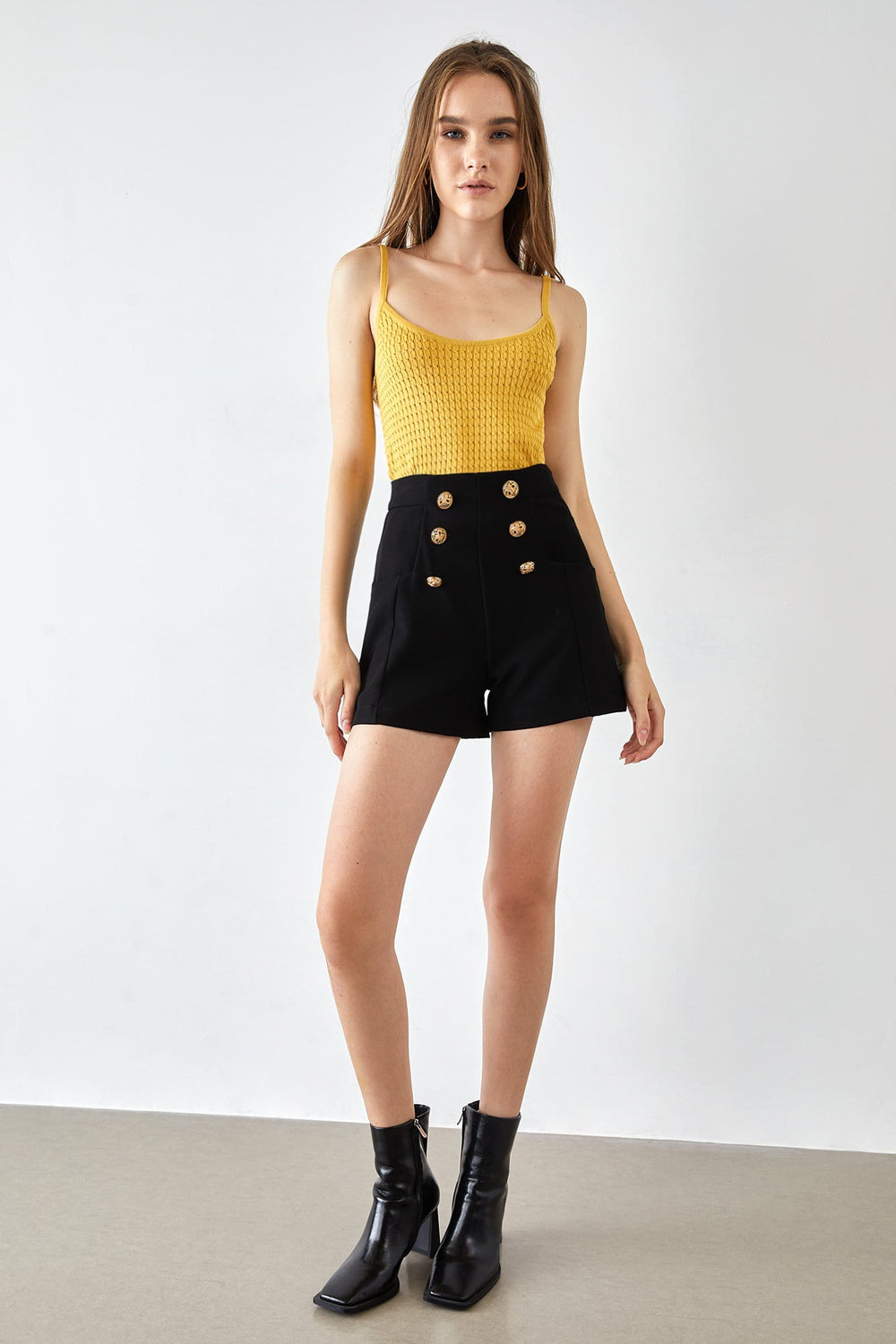 These shorts featuring big button detailing and pocket decoration. These charming trouser shorts can be paired with Violette Tank Top a co-ord look.