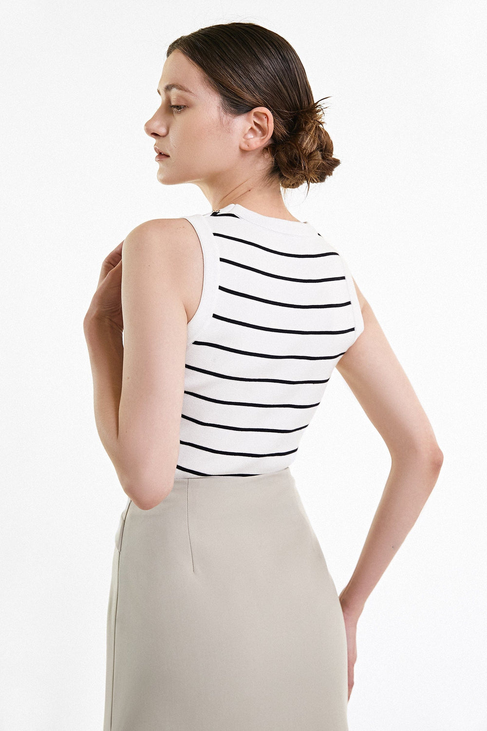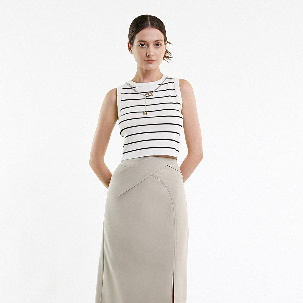 This tank top is perfect for getting you noticed. Featuring a contrasting stripe design with a detachable chain necklace (with a letter 'B' pendant) . a round neckline. and a cropped length. Wear with figure-hugging bottoms and heeled mules for a style we are loving.