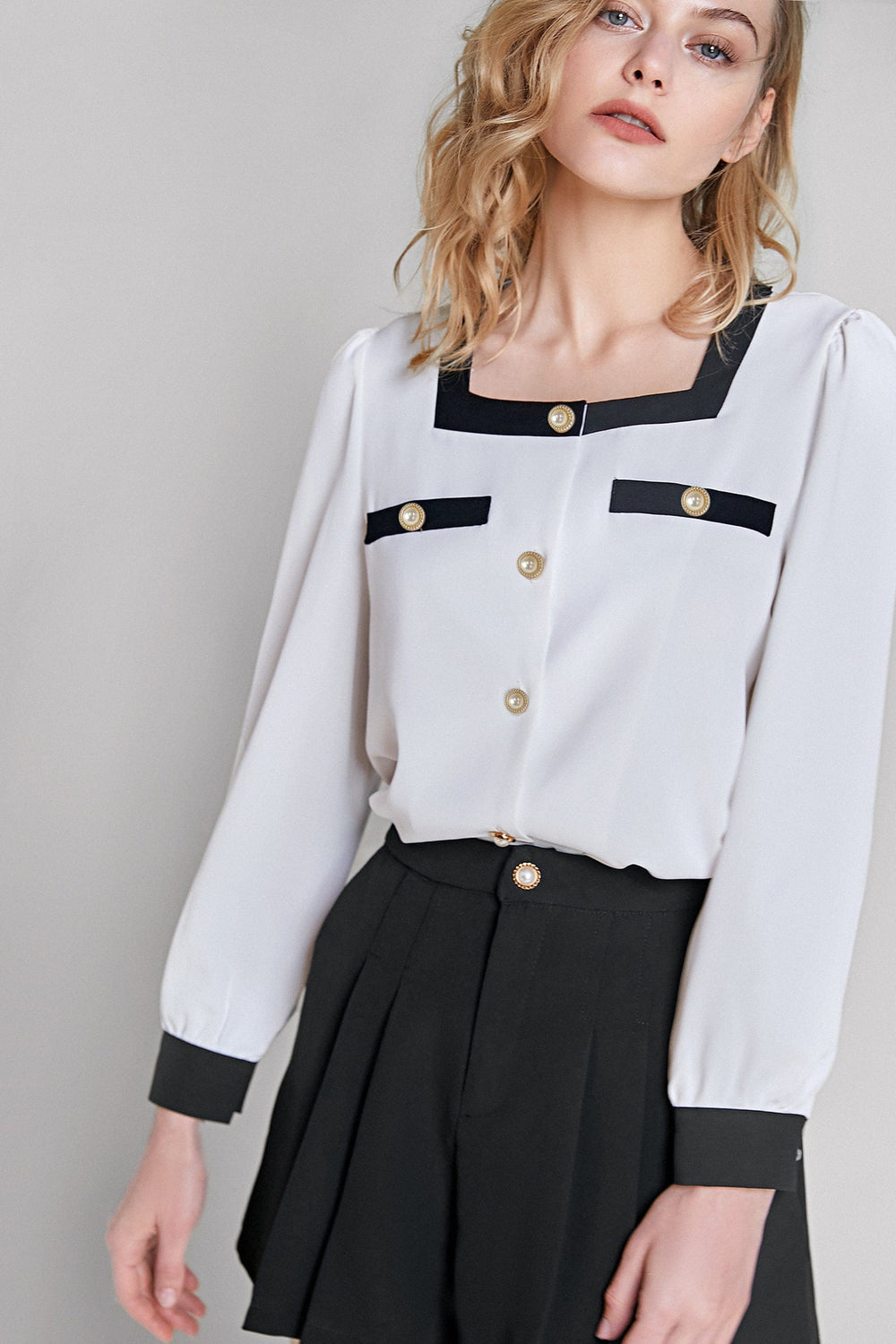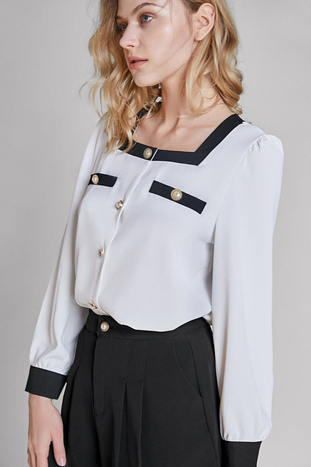 Work your styling techniques to make this top fit any occasion. Featuring a white chiffon material with a faux pearl button front. a sweetheart neckline. contrast trim. and long sleeves with button cuffs. Team with jeans and heels for a look we're loving.