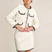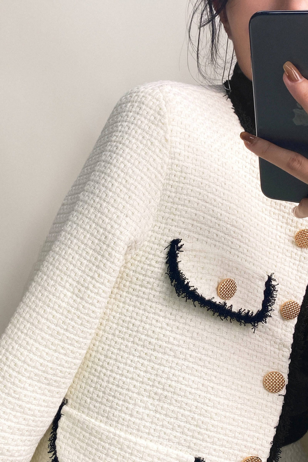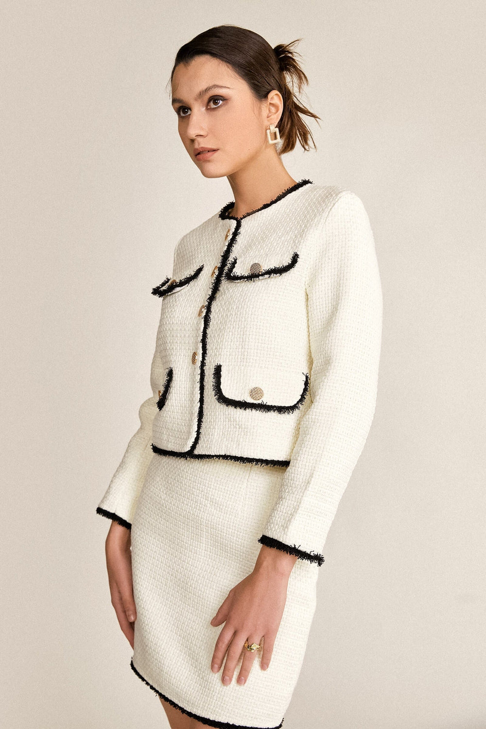 Give your wardrobe a refresh with the Two Piece Set. It's comprised of a jacket and mini skirt made from a stunning soft tweed fabric. The top is shaped with contrasting frayed trim. long sleeves. front flap pockets. and button closure. The mini skirt features a high-rise fit and a contrasting frayed hem. Pair it with some heeled sandals and a mini bag to match for a chic look!