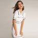 Add this statement dress to your wardrobe. Featuring a stretchy knit material with a lapel collar. decorative gold-toned buttons. short sleeves. chest pockets. and an A-line mini skirt. Team with heeled mules and gold accessories.