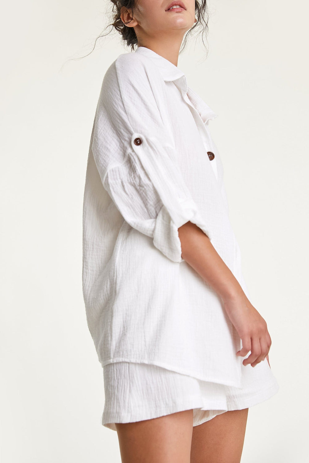 Make the two-piece set your new go-to this summer. It's comprised of a shirt and wide leg shorts made from a soft cotton fabric. This relaxed and breezy shirt is slightly textured and it features a collar. buttons down the front and rolled up long sleeves. The matching shorts feature an elasticated waist and a wide leg fit. Perfectly versatile and easy to style. you can wear it together or as separates and dress it up or down.