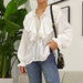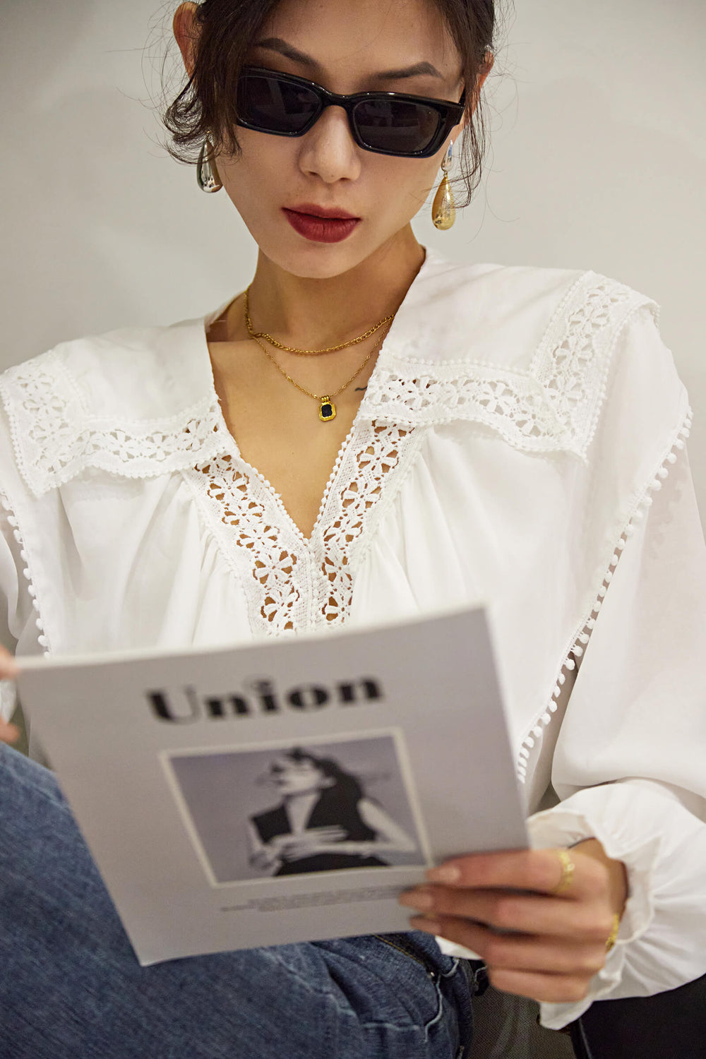 A simple and versatile blouse features a lovely doll collar. a delicate cut-out front closure. and long sleeves. An ideal collection for daily wear and office wear.