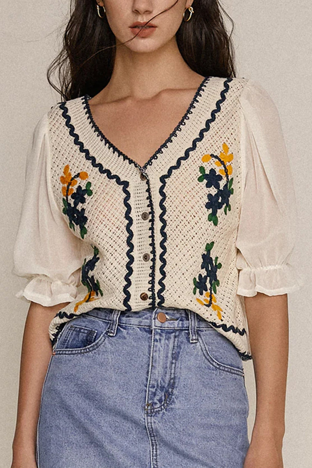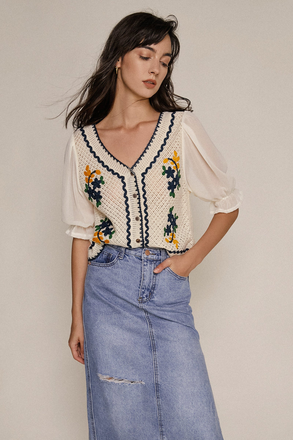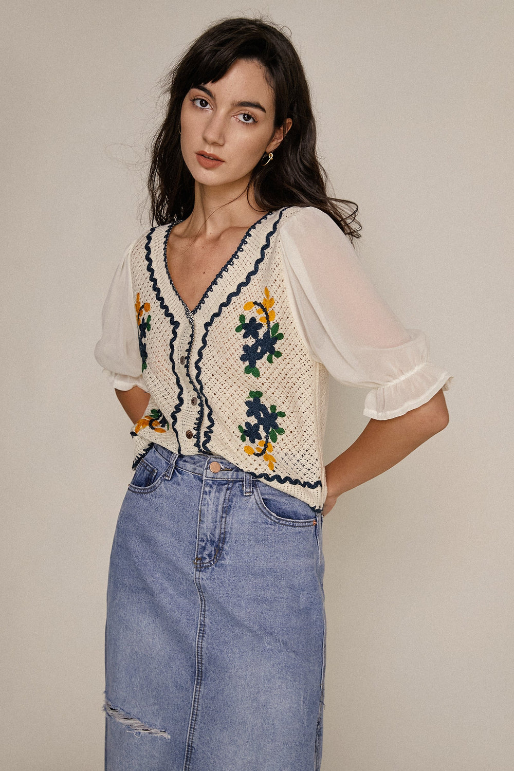 Upgrade your wardrobe with this cardigan! Featuring pointelle knit with embroidered floral design. front button closure. contrasting trim. and semi-sheer sleeves with elastic cuffs. Wear it out to a casual day hang with a crop top. jeans. sneakers and a baguette bag for a 10/10 look!