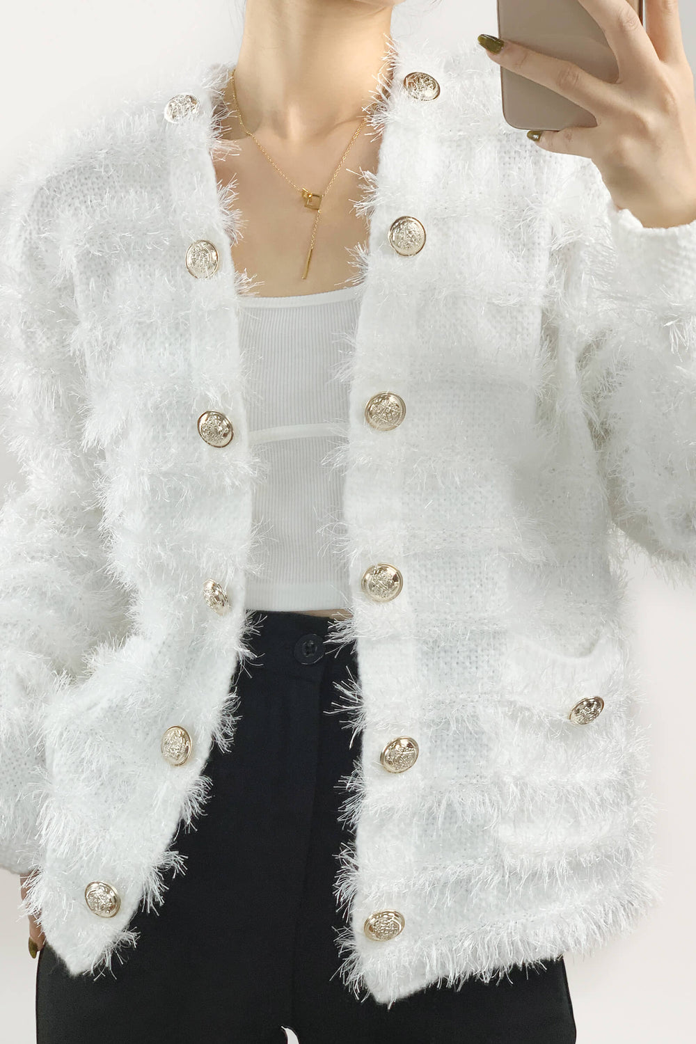 This stunning cardigan features two rows of embossed gold-toned buttons down the front. a V-neckline. long sleeves. front patch pockets. a relaxed fit and allover frayed trim that adds a chic finishing touch.