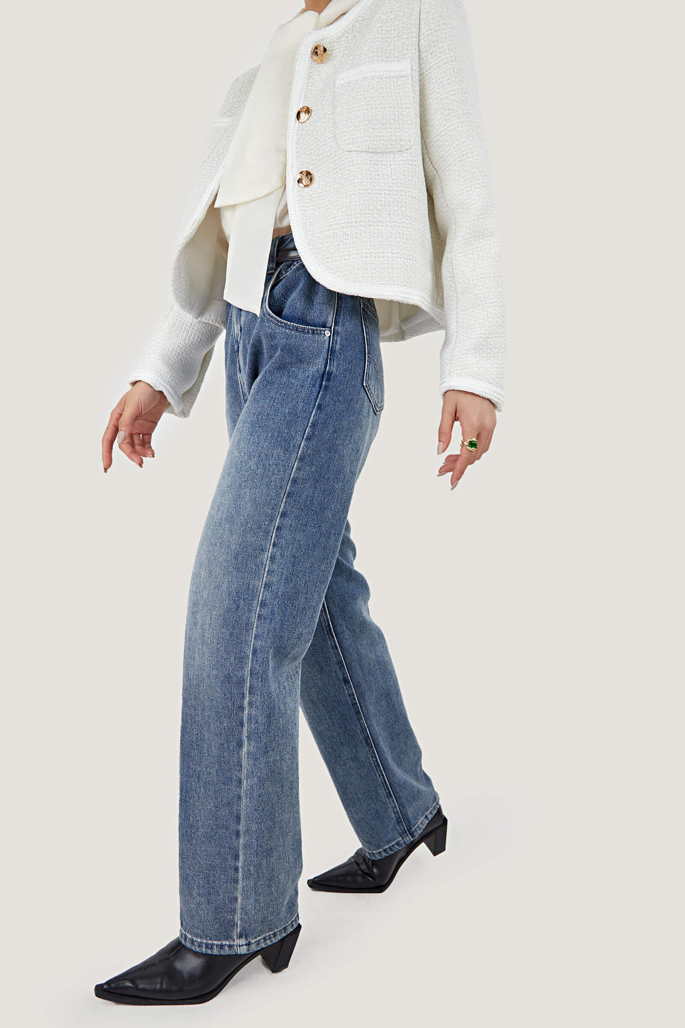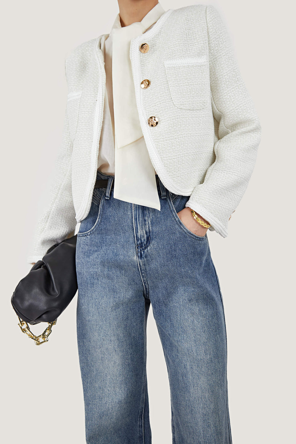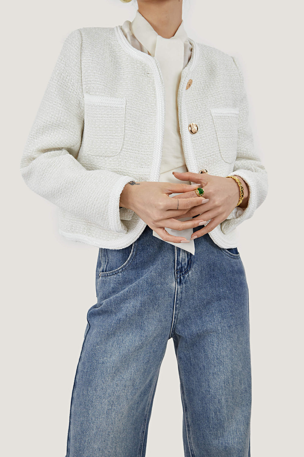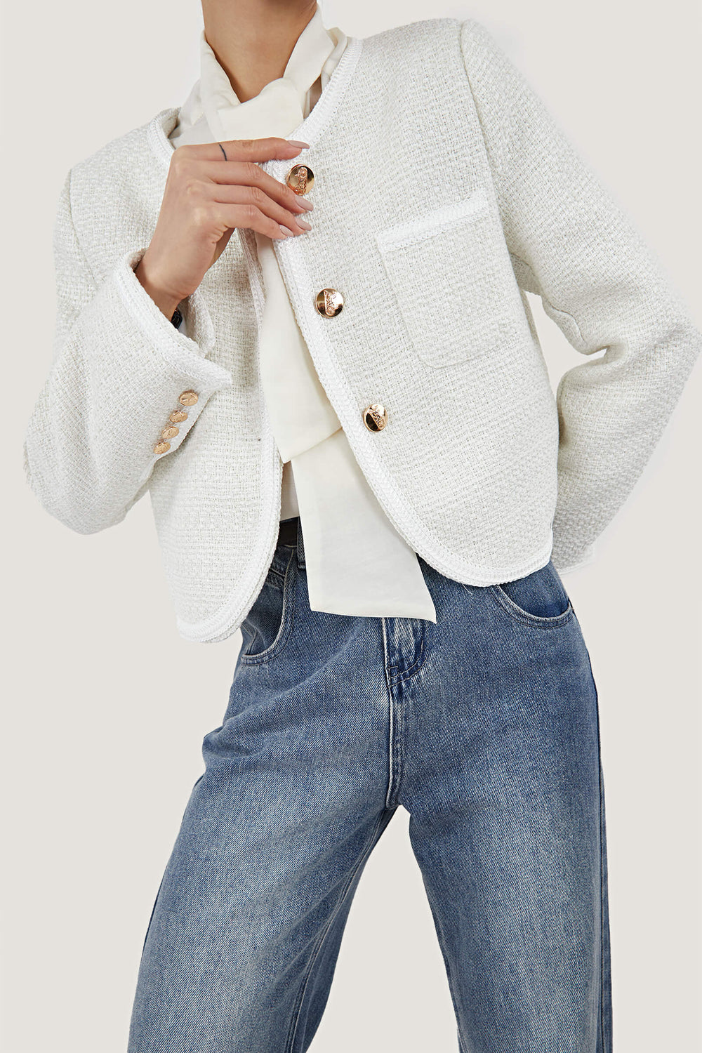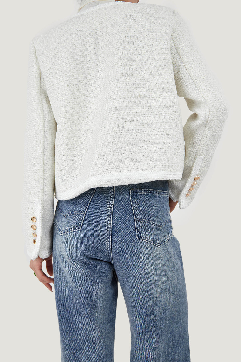 Serve up chic retro lady vibes with this jacket. It's made from a stunning midweight tweed fabric. The top is shaped with long sleeves. front patch pockets. and front button closure. Pair it with some heeled boots and a mini skirt to match for a chic look!