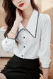 This adorable shirt features a dramatic lapel collar with ruffles and lovely. long sleeves. A blousey shirt is perfect for wearing with high waisted pants or pleated skirt for a academy look. Available in both black and white.