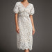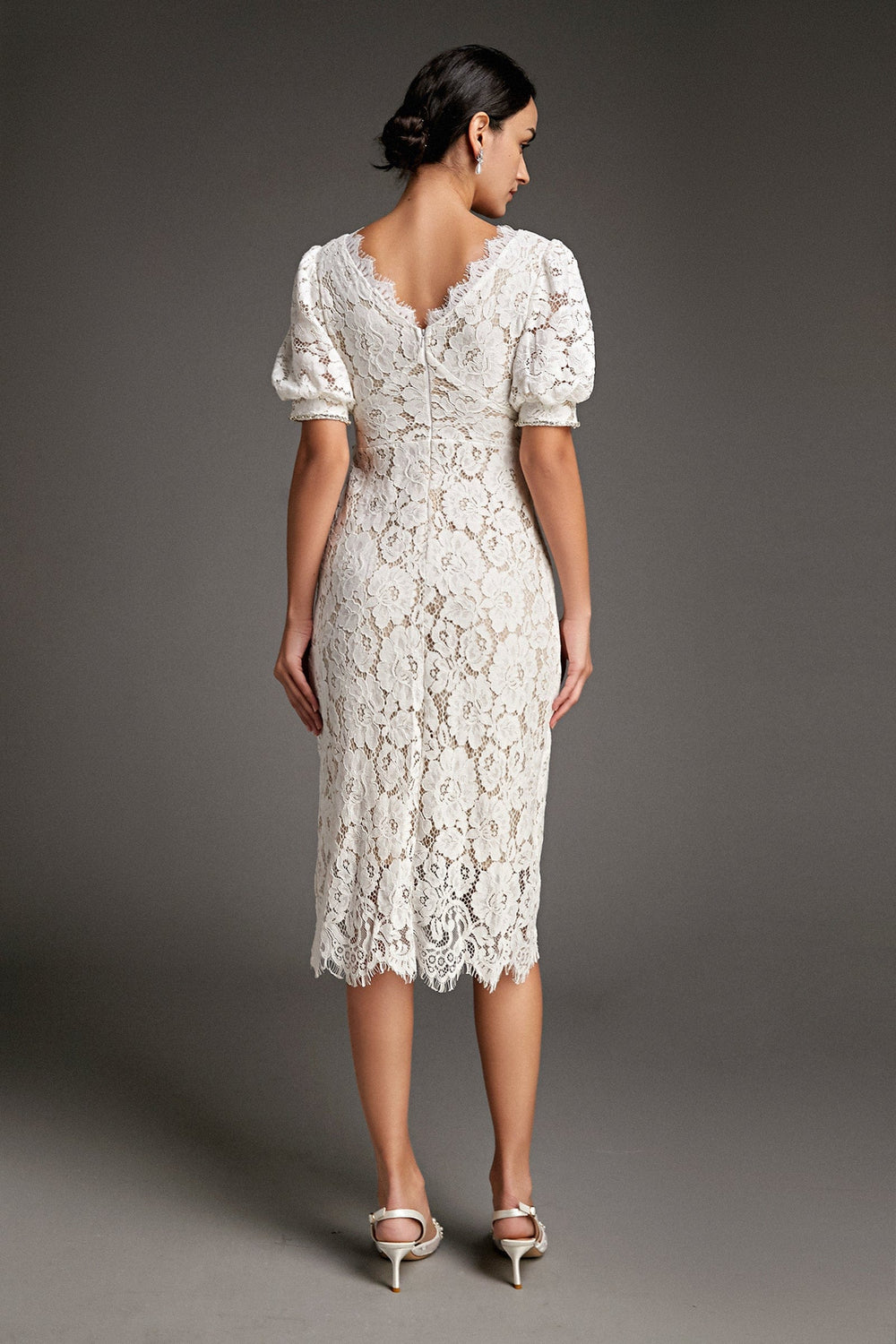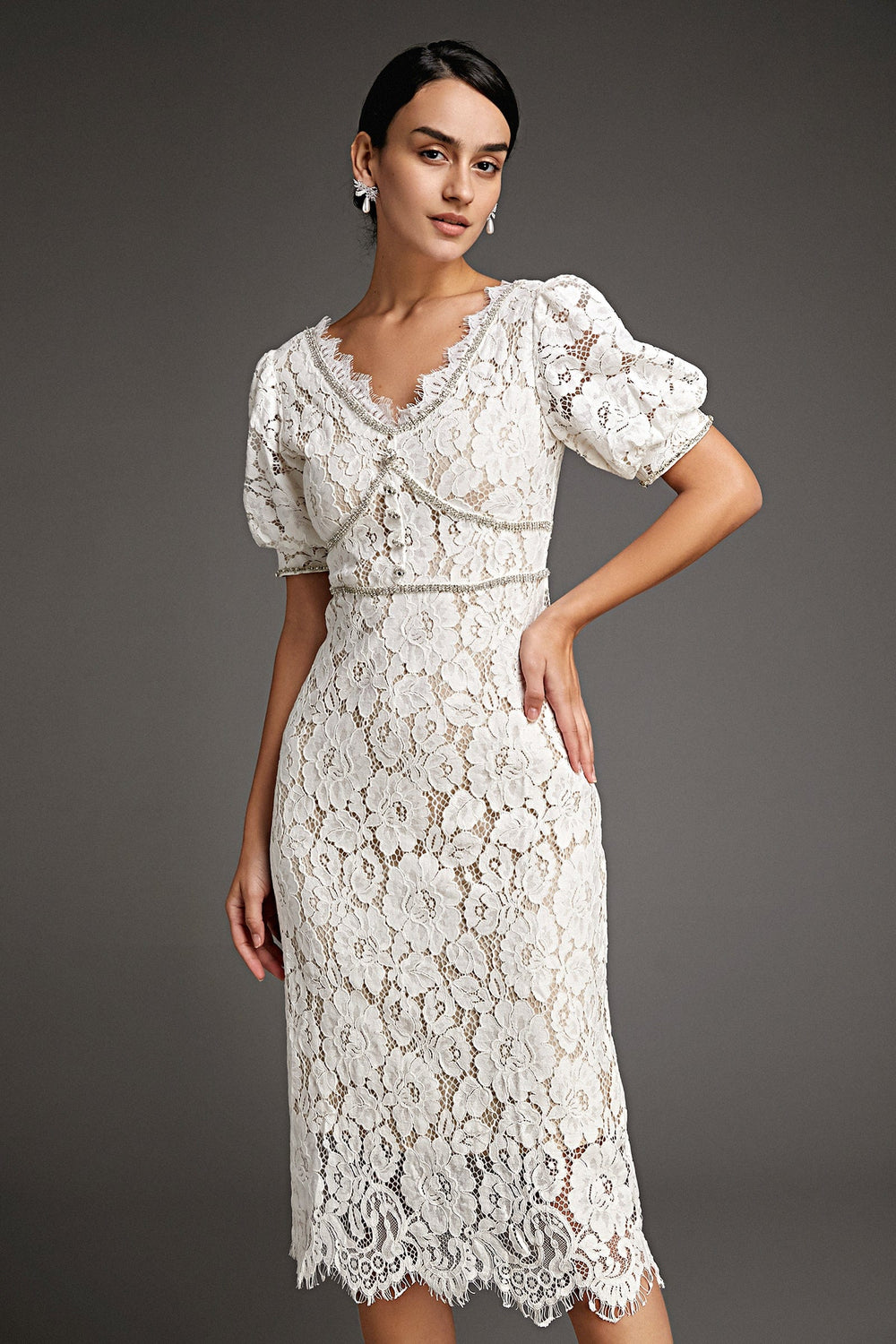 This lace crochet V-neckline midi dress will fill any of your little white dress needs. from your bridal shower to your after party. The textured lace overlay. accented with thick embroidery that outlines the lace's blooms. Also features puff sleeves and delicate scalloped eyelash lace hem. The rhinestone trim and buttons adds an extra glitz and glam.