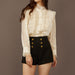 A simple and versatile shirt features a lovely lacy collar. a delicate cut-out front closure. and long sleeves. An ideal collection for daily wear and office wear.