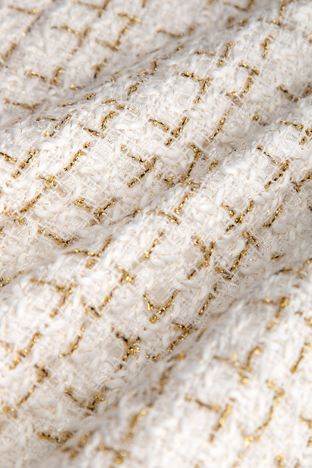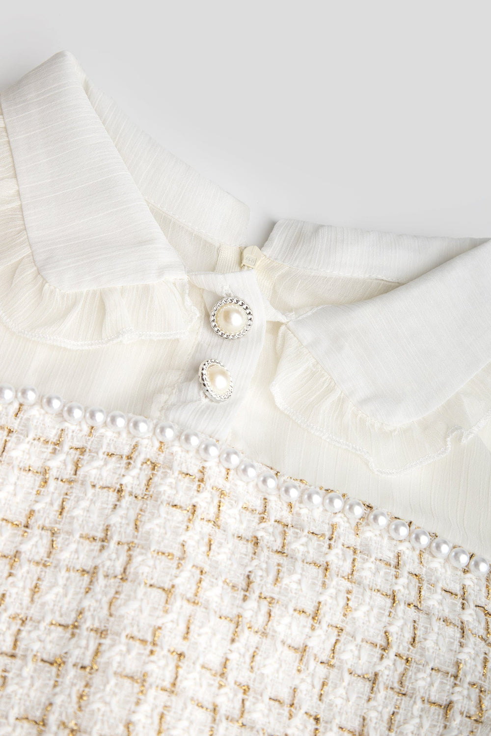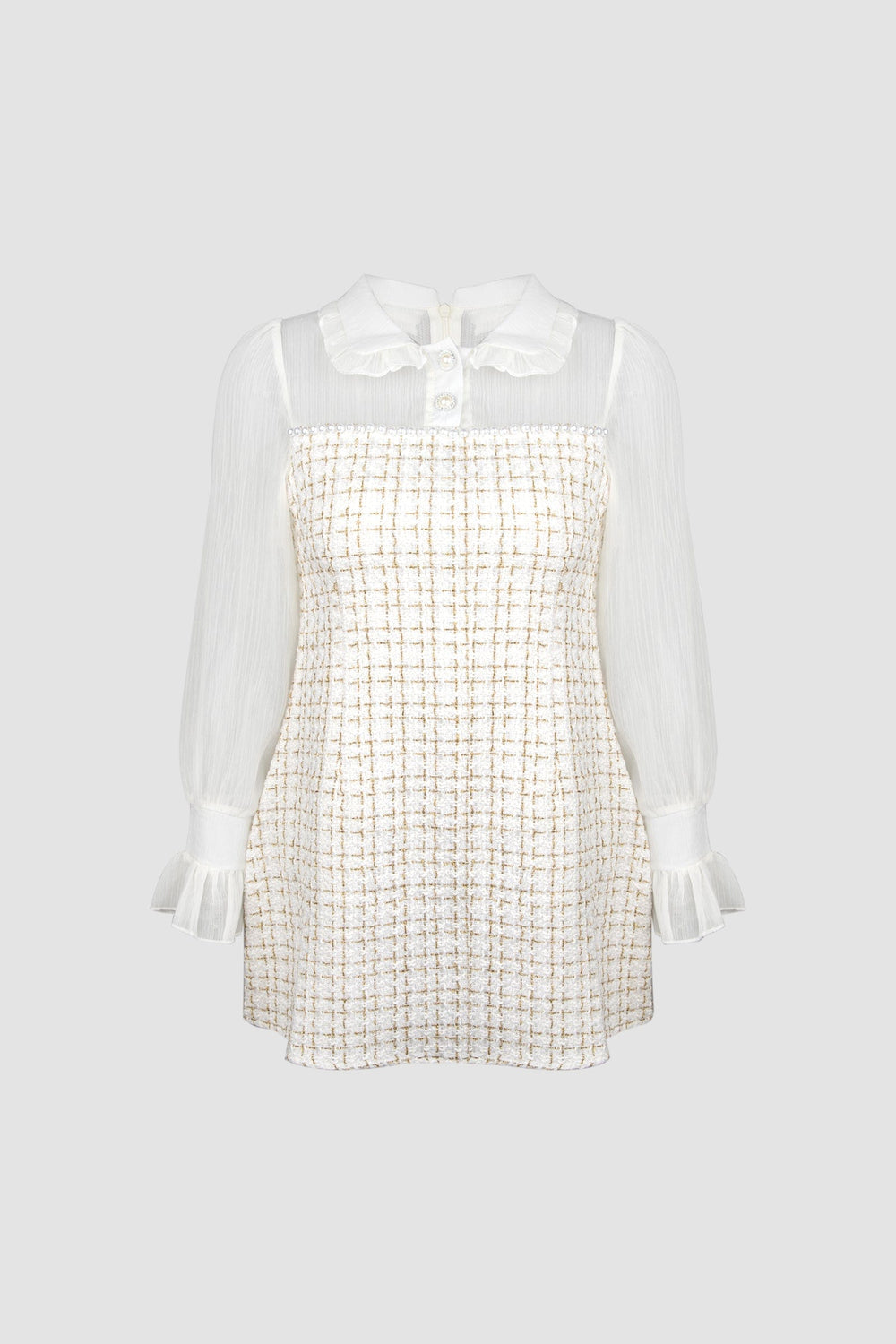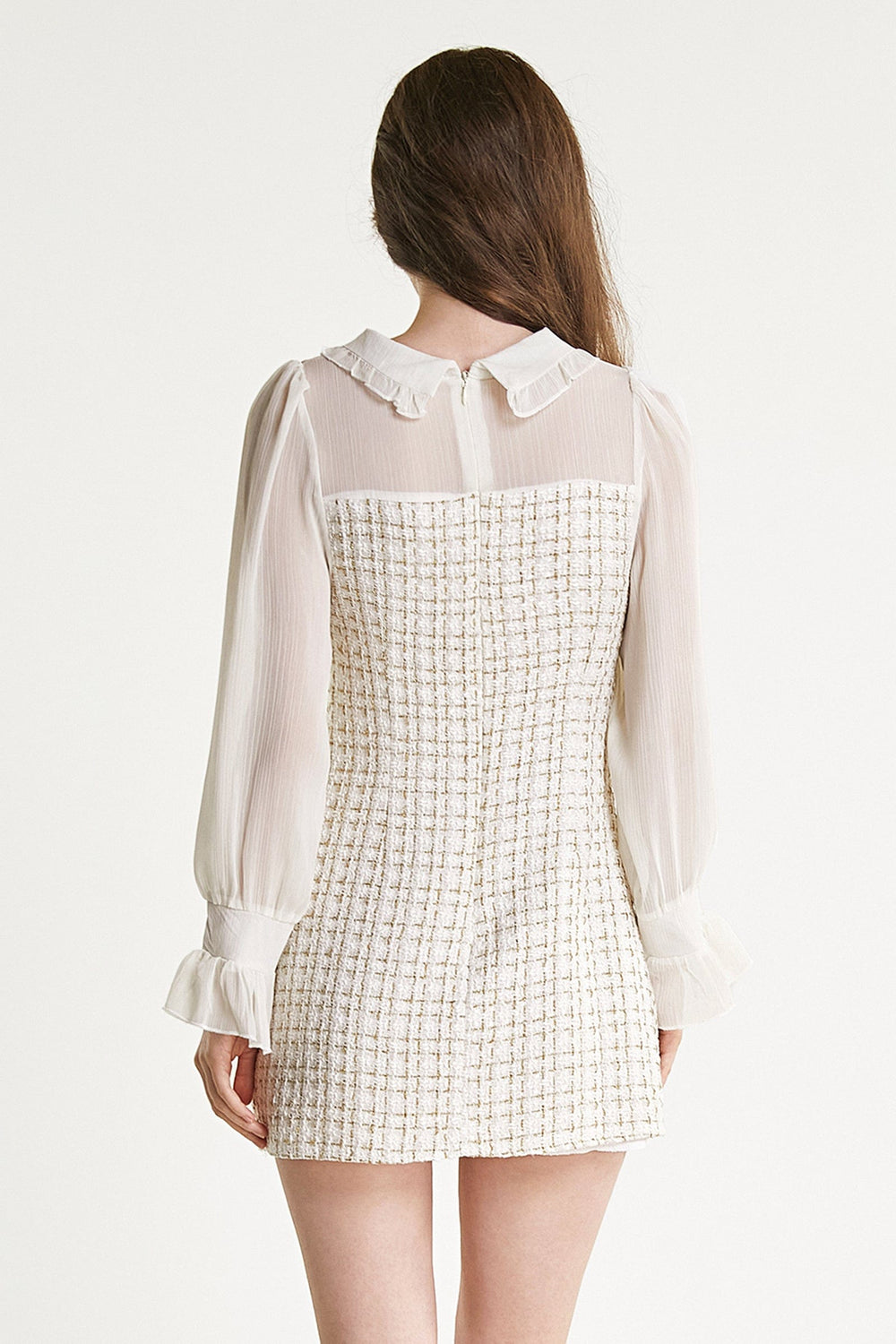 Tweed all about it in this stunning dress boasting the classic fabric with mesh sleeves. a collared neckline. and short yet flared silhouette. Make a chic entrance to a cocktail party with a pair of platform heels.