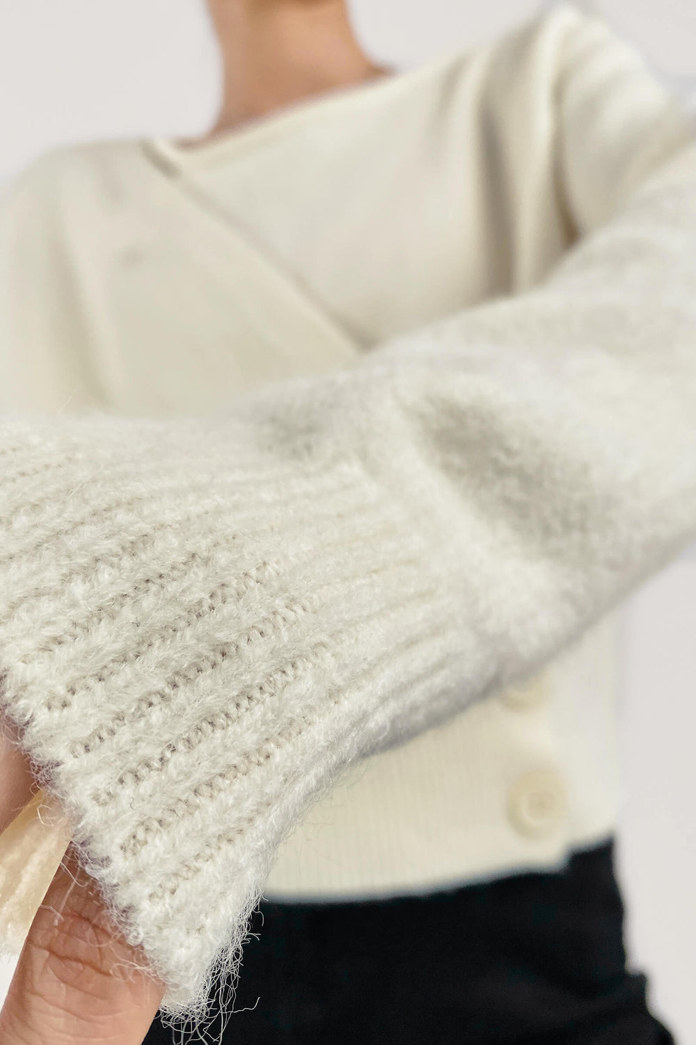 Fine knit fabric. Tailored design. Crossover design. Crew-neck. Long Sleeves.Made of acrylic.polyester and nylon.