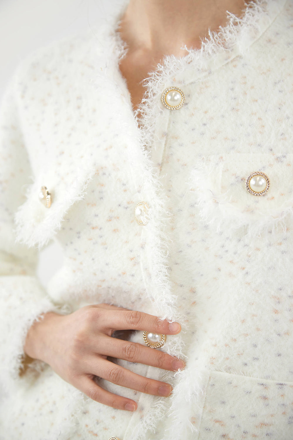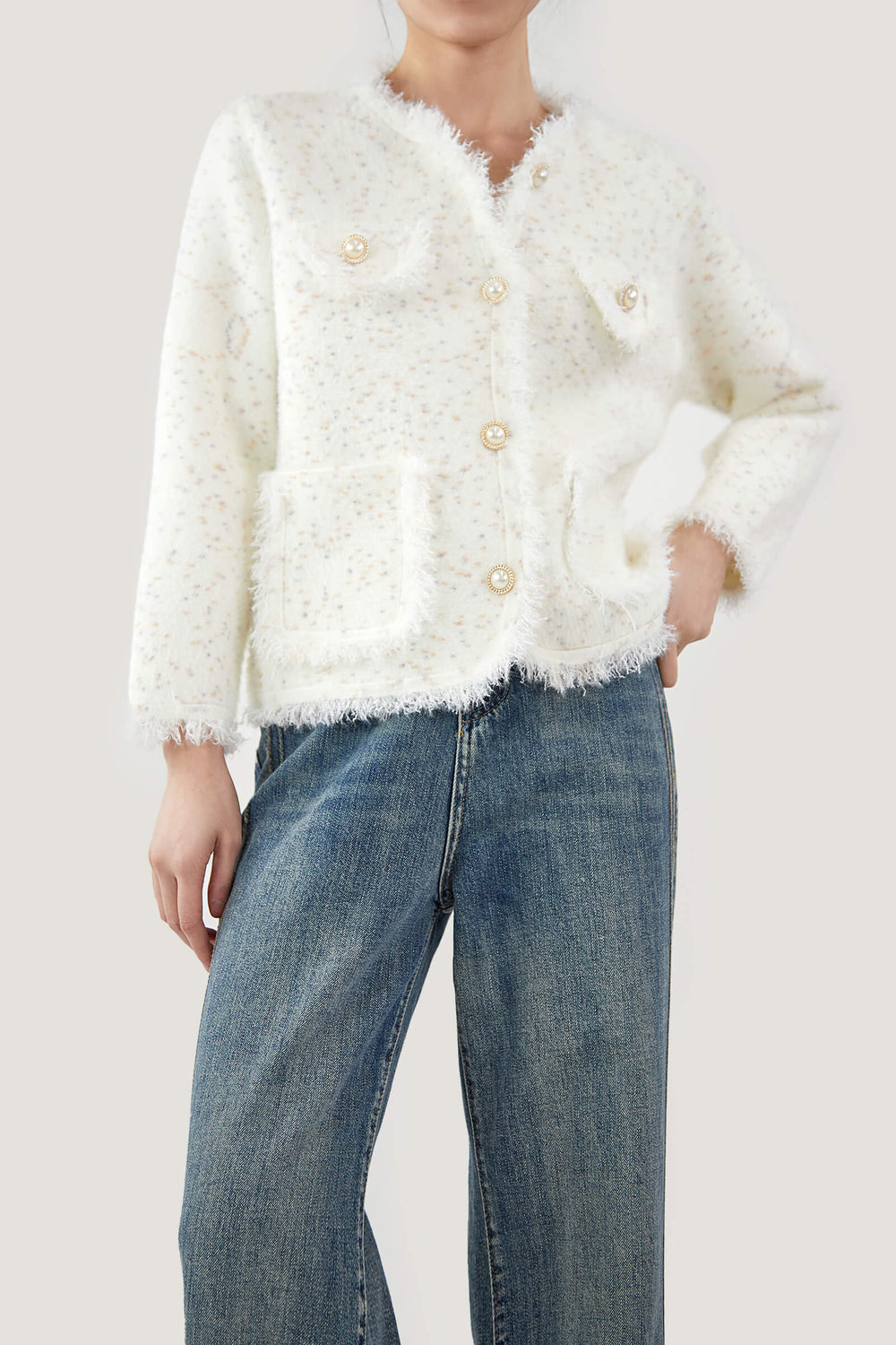 This cardigan features a v-neck design. frayed trim. a button-up front. a longline fit.Made of acrylic. polyester and nylon.