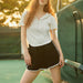 A ribbed knit T-shirt featuring a drawstring hood. half-zip fastening. short sleeves. a curved hem. and a relaxed silhouette.