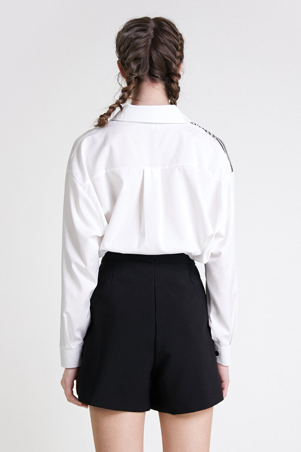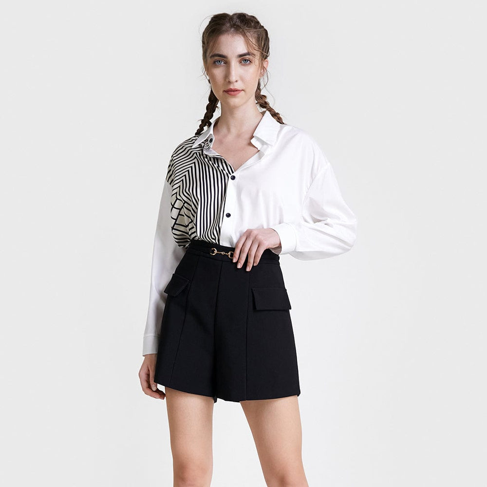 Take your look to new heights with this chic piece. Featuring a white material with a contrasting stripe print. a button down front. and an asymmetrical hem. Pair with fresh kicks for an effortless off-duty vibe.