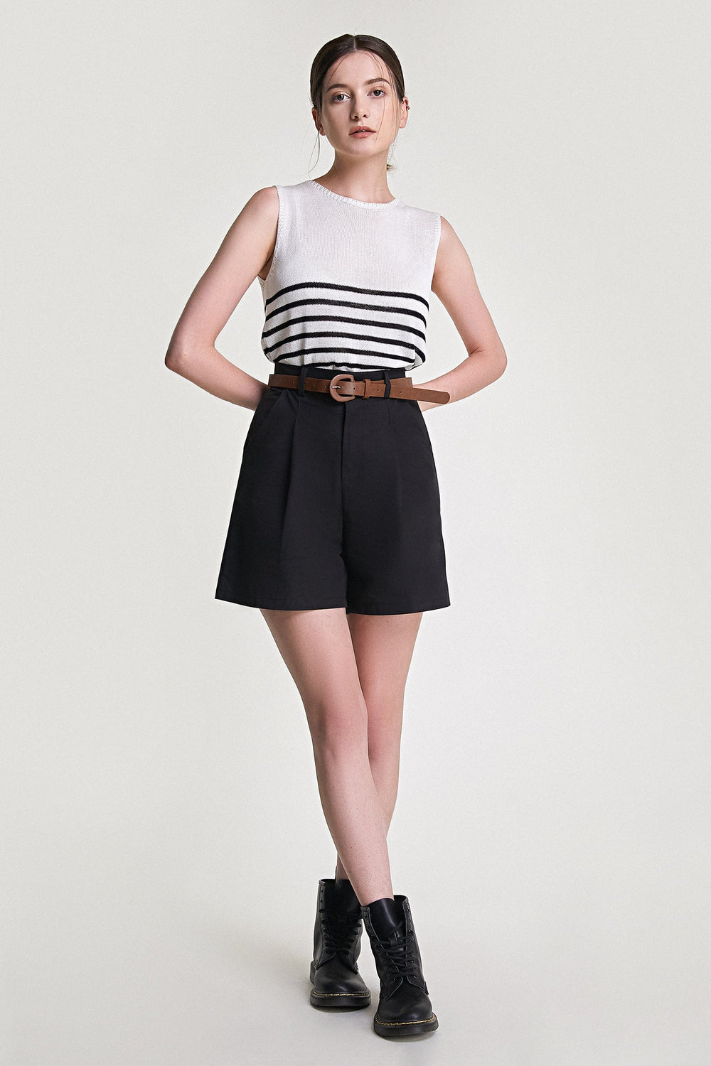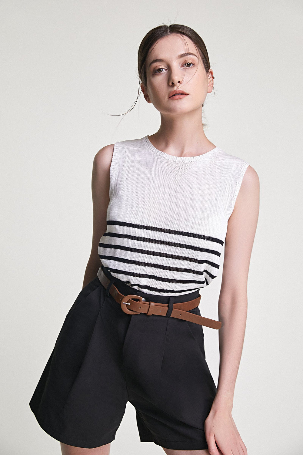 Spice up your wardrobe essential with this tank top. In a soft. lightweight knitted fabric with a round neckline and contrasting black stripes. Is the perfect tank to be part of your closet!