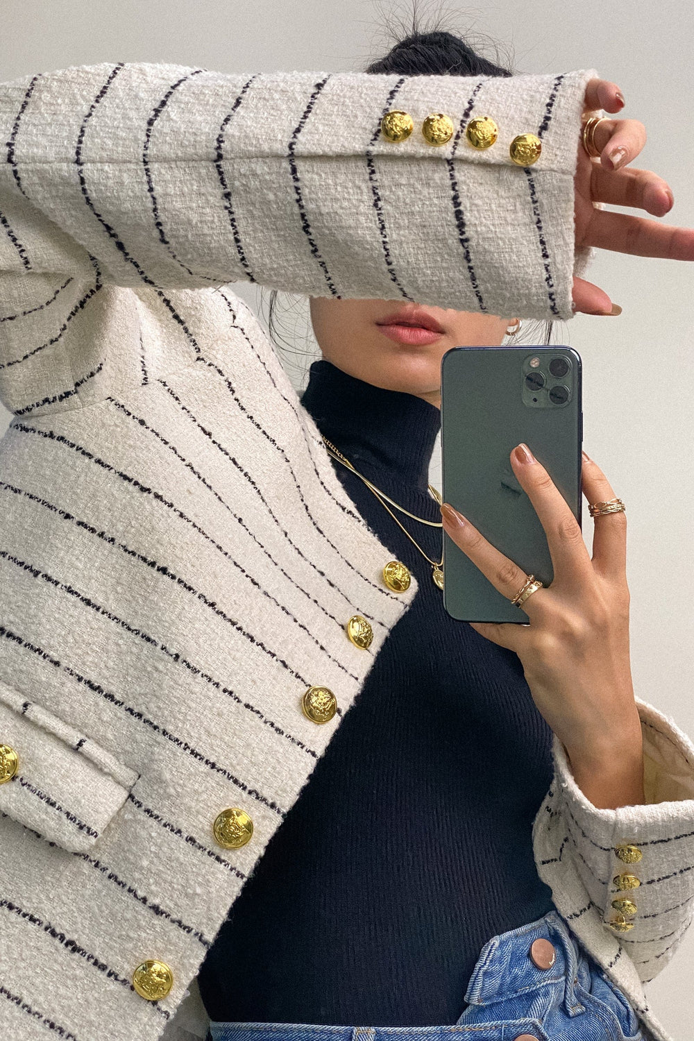 A vibrant twist of sophisticated tweed jacket. Featuring a white tweed material with contrasting black stripes throughout. a timeless collarless silhouette. a button front. and long sleeves. The engraved gold-tone buttons provide plenty of glamour. Put your styling techniques to the test and add a matching skirt and gold accessories to tie the whole look together.