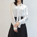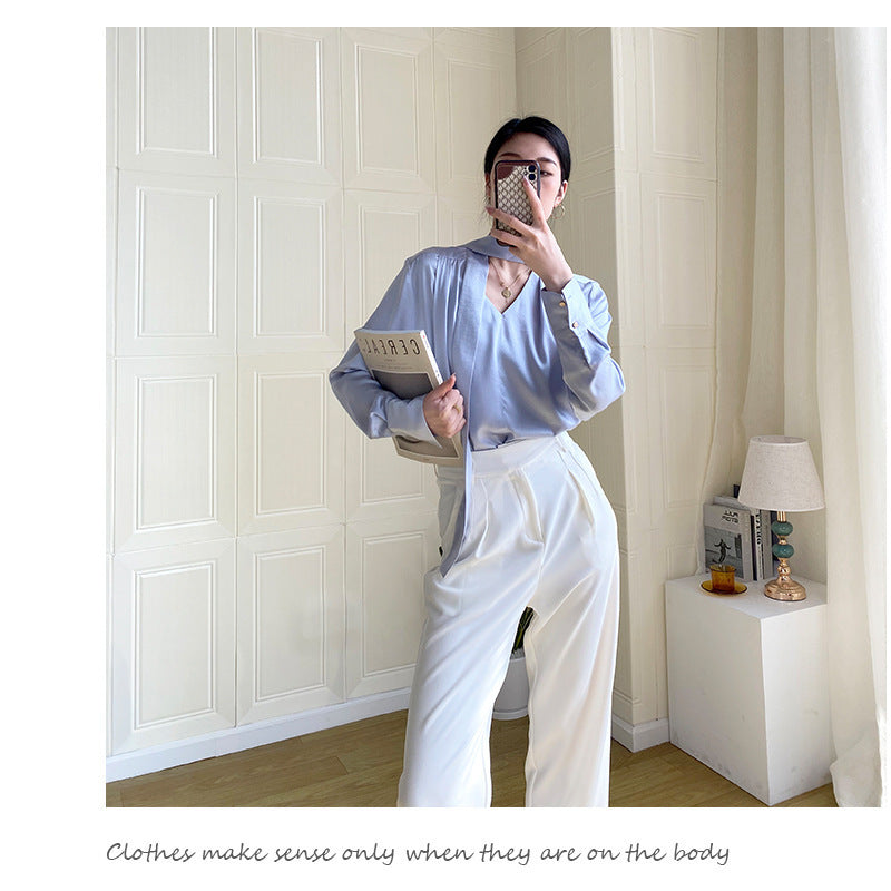 Everyone can totally tell how stylish you're looking today with the White Tie Neck Satin Blouse!Lightweight. satinfabric forms a v neckline and long sleeves and button cuffs. Made of 100% polyester.