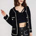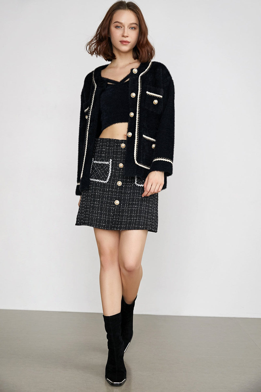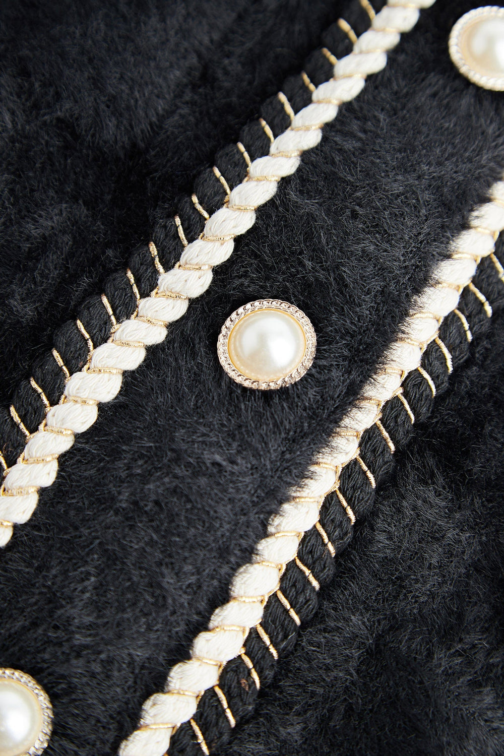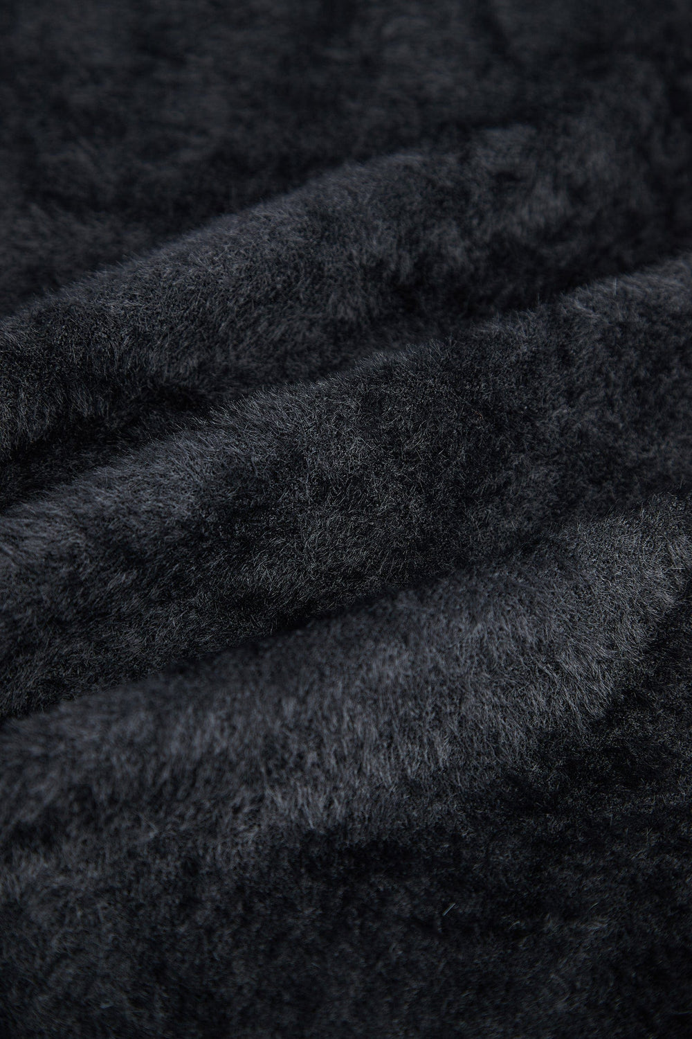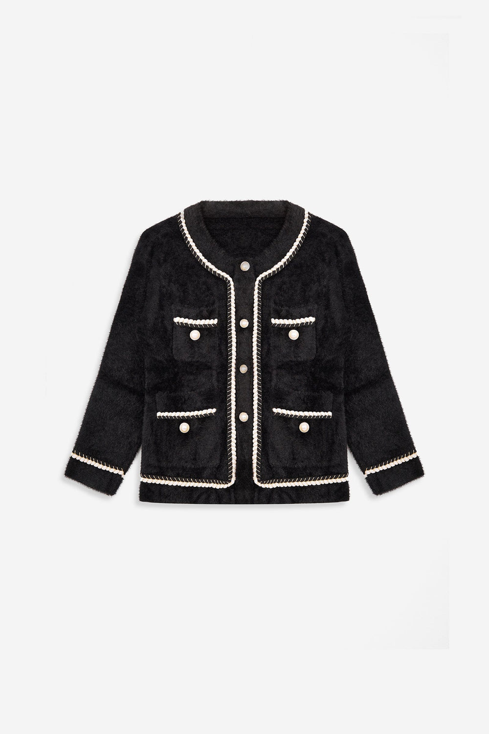 This oversized fuzzy cardigan features a longline fit. a contrast trim. front pockets. and button up closure. Made of mohair and cotton. Available in white and black.