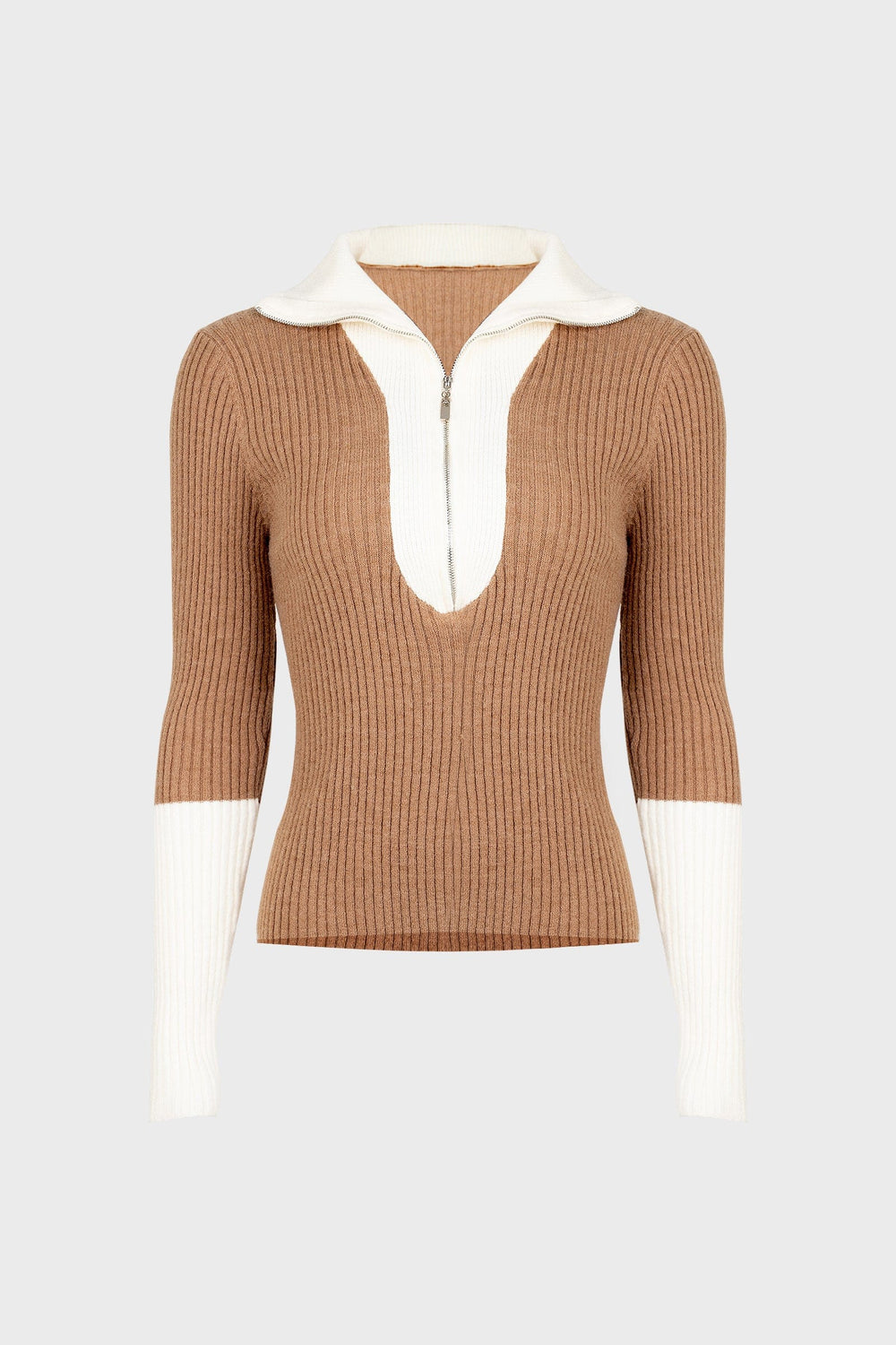 This sweater features contrast trim. a zip-lapel collar. and long sleeves. Add it to your winter collection. Made of acrylic. polyamide. wool. alpaca wool and spandex.