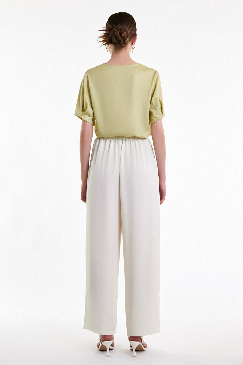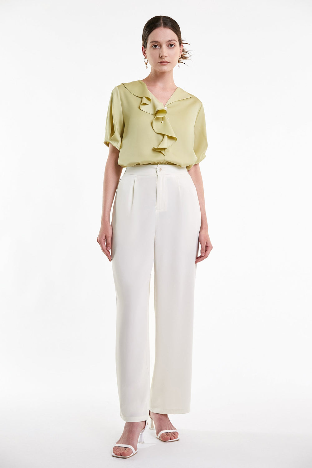 A simple top that is perfect for dressing up or down. Featuring a lightweight fabric with flounce-trimmed V-neckline. short sleeves. and a relaxed fit. team it with your fave pair of jeans for a combo that can be styled to fit any occasion.